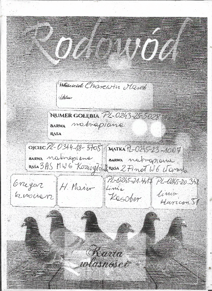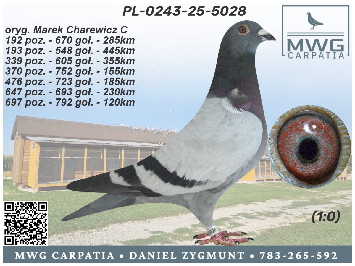 Opis: Gołąbek z MWG Carpatia, po całym sezonie lotowym 2025. Drużyna: Marek Charewicz C, 192 z 285 km i 193 z FINAŁU!!. Zorganizowaliśmy 9 lotów treningowych do 92km oraz 7 lotów konkursowych od 105 do 445km, a także ekstra finał z odległości 505km. Ptaki łącznie zrobiły 2153km, a niektóre nawet 2658km. Cały sezon był ciężki i wymagający, więc wszystkie ptaki, które sobie poradziły są warte i cenne uwagi. Więcej informacji pod numerem 783-265-592. Transport 100 zł do 2szt. Do 3-4szt - 150zł. Powyżej 5szt - 200zł. Zapraszamy do udziału w edycji 2026 :)