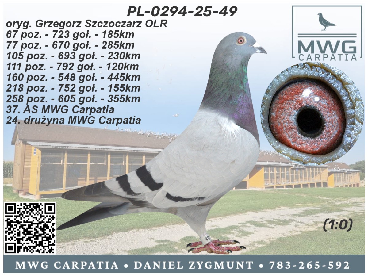 Opis: Gołąbek z MWG Carpatia, po całym sezonie lotowym 2025. Drużyna: Grzegorz Szczoczarz OLR C, 67 z 185 km i 77 z 285 km. *MOŻLIWOŚĆ WYKONANIA DNA* Zorganizowaliśmy 9 lotów treningowych do 92km oraz 7 lotów konkursowych od 105 do 445km, a także ekstra finał z odległości 505km. Ptaki łącznie zrobiły 2153km, a niektóre nawet 2658km. Cały sezon był ciężki i wymagający, więc wszystkie ptaki, które sobie poradziły są warte i cenne uwagi. Więcej informacji pod numerem 783-265-592. Transport 100 zł do 2szt. Do 3-4szt - 150zł. Powyżej 5szt - 200zł. Zapraszamy do udziału w edycji 2026 :)