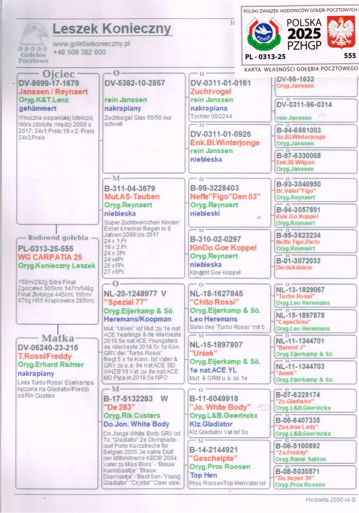 Gołąbek z MWG Carpatia, po całym sezonie lotowym 2025. Drużyna: Konieczny Leszek A, 147 z FINAŁU!! i 154 z 120 km. Zorganizowaliśmy 9 lotów treningowych do 92km oraz 7 lotów konkursowych od 105 do 445km, a także ekstra finał z odległości 505km. Ptaki łącznie zrobiły 2153km, a niektóre nawet 2658km. Cały sezon był ciężki i wymagający, więc wszystkie ptaki, które sobie poradziły są warte i cenne uwagi. Więcej informacji pod numerem 783-265-592. Transport 100 zł do 2szt. Do 3-4szt - 150zł. Powyżej 5szt - 200zł. Zapraszamy do udziału w edycji 2026 :)