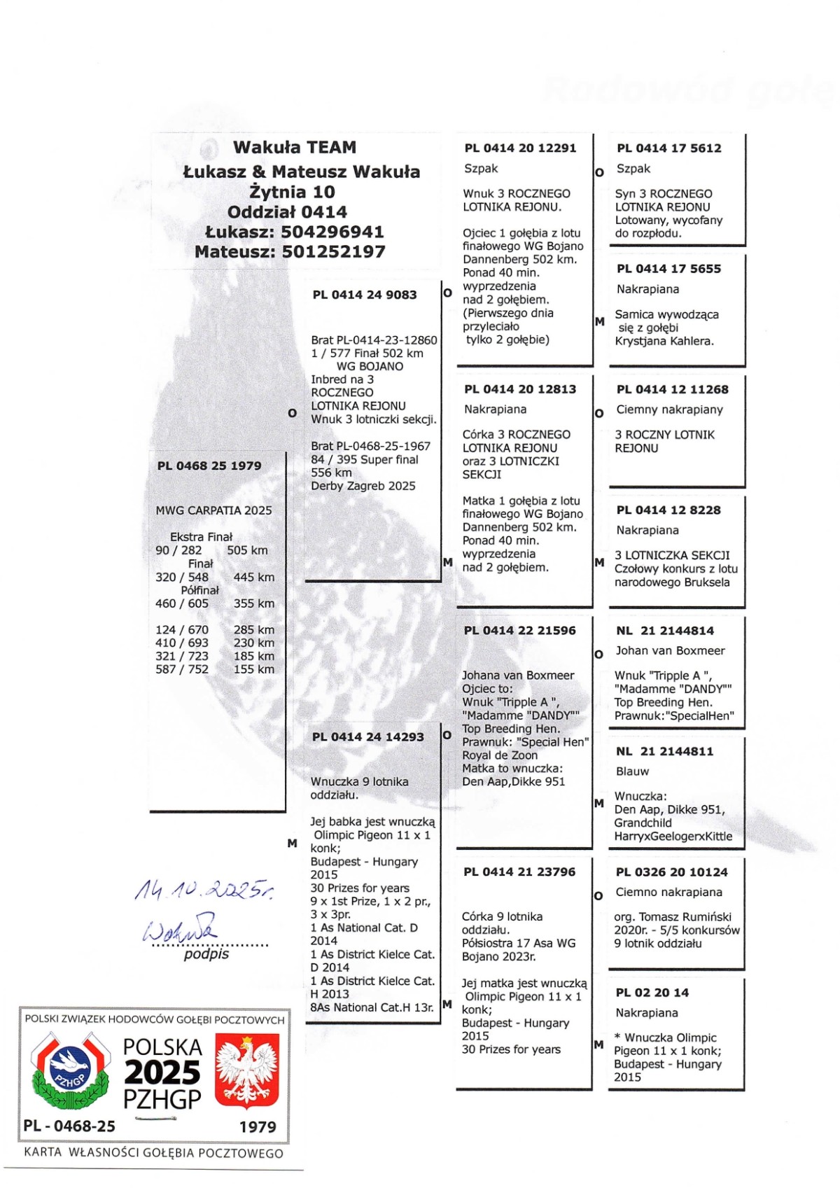 Gołąbek z MWG Carpatia, po całym sezonie lotowym 2025. Drużyna: Wakuła Team 2, 90 z 505 km i 124 z 285 km. Zorganizowaliśmy 9 lotów treningowych do 92km oraz 7 lotów konkursowych od 105 do 445km, a także ekstra finał z odległości 505km. Ptaki łącznie zrobiły 2153km, a niektóre nawet 2658km. Cały sezon był ciężki i wymagający, więc wszystkie ptaki, które sobie poradziły są warte i cenne uwagi. Więcej informacji pod numerem 783-265-592. Transport 100 zł do 2szt. Do 3-4szt - 150zł. Powyżej 5szt - 200zł. Zapraszamy do udziału w edycji 2026 :)