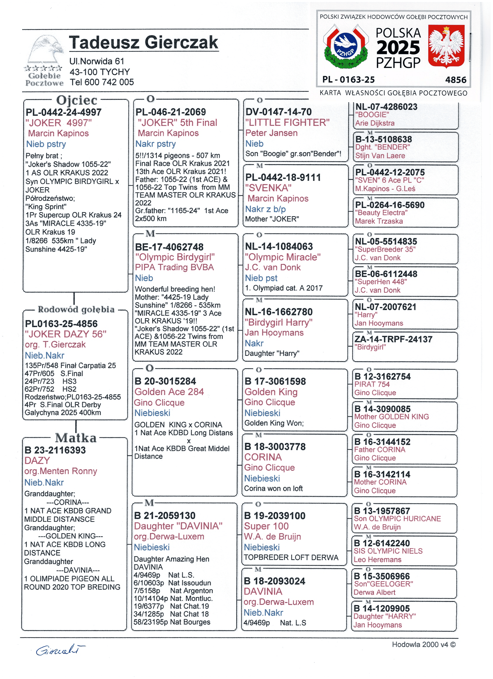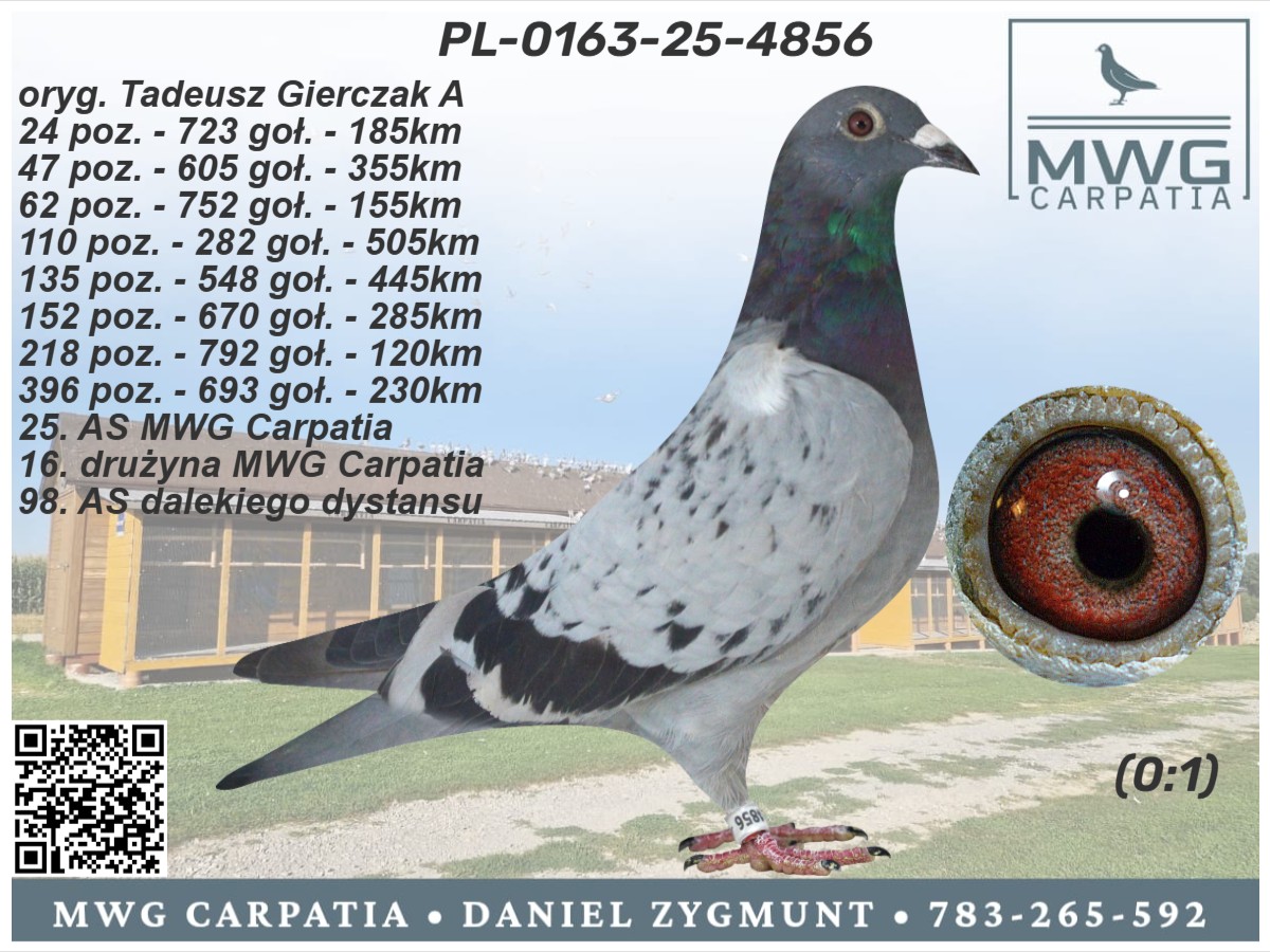 Gołąbek z MWG Carpatia, po całym sezonie lotowym 2025. Drużyna: Tadeusz Gierczak A, 24 z 185 km i 47 z 355 km. Zorganizowaliśmy 9 lotów treningowych do 92km oraz 7 lotów konkursowych od 105 do 445km, a także ekstra finał z odległości 505km. Ptaki łącznie zrobiły 2153km, a niektóre nawet 2658km. Cały sezon był ciężki i wymagający, więc wszystkie ptaki, które sobie poradziły są warte i cenne uwagi. Więcej informacji pod numerem 783-265-592. Transport 100 zł do 2szt. Do 3-4szt - 150zł. Powyżej 5szt - 200zł. Zapraszamy do udziału w edycji 2026 :)
