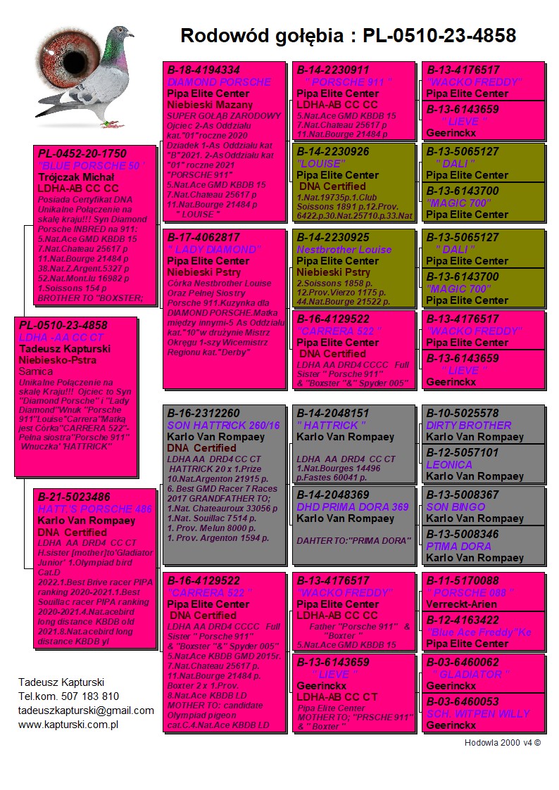 Oryginalny gołąb z hodowli Tadeusza Kapturskiego. Szczegóły pochodzenia w rodowodzie. Więcej informacji pod nr tel.: 507183810 ***transport kurier 165 zł ***NA ŻYCZENIE CERTYFIKAT DNA
