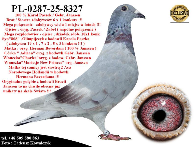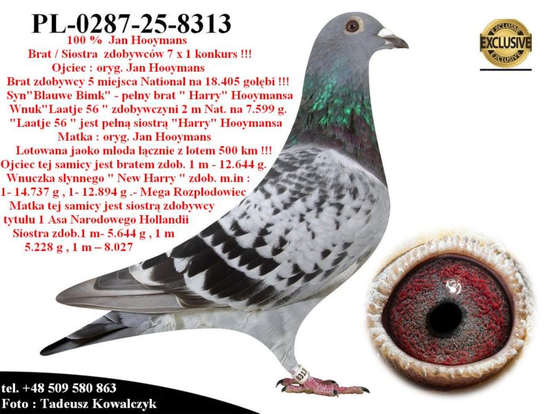 PL-0287-25-8313 Unikat - Potomek najlepszych gołębi z hodowli Jana Hooymansa