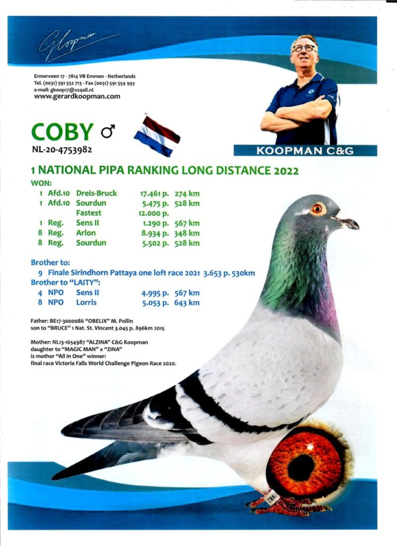 AUKCJA PROMOCYJNA ROCZNIKA 2025 (Cena obowiązuje wyłącznie na tej aukcji) Profesjonalna hodowla z wieloletnim doświadczeniem, posiadająca w swoim stadzie materiał najwyższej światowej klasy, wywodzący się od takich hodowców jak: Jan Hooymans, Gerard Koopman, Mike Ganus, Tjeerd & Jouke Elzinga, Gino Clicque, Jos Vercammen, Jelle Roziers, Bart Geerinckx, Batenburg – v/d Merwe, Altmiks – Pigeons, Jo & Florian Hendriks, Kornelis Winner Loft – linia „Romario”, W & F Ebben, Bert Braspenning, Dirk van den Bulck, Peter v/d Merwe, Jan van de Pasch, Van Elsacker-Jepsen, Roger Desmet – Matthijs, Arie Dijkstra, Leo Heremans, Pieter Veenstra, Gaby Vandenabeele, Karl-Heinz Wichert, Hardy Kruger, Helmut & Alfons Klaas, Gebr. Janssen. Najwyższej klasy materiał hodowlany – najlepsze linie danych Hodowców. Wszystkie wylicytowane gołębie będą dostarczane firmą kurierską .