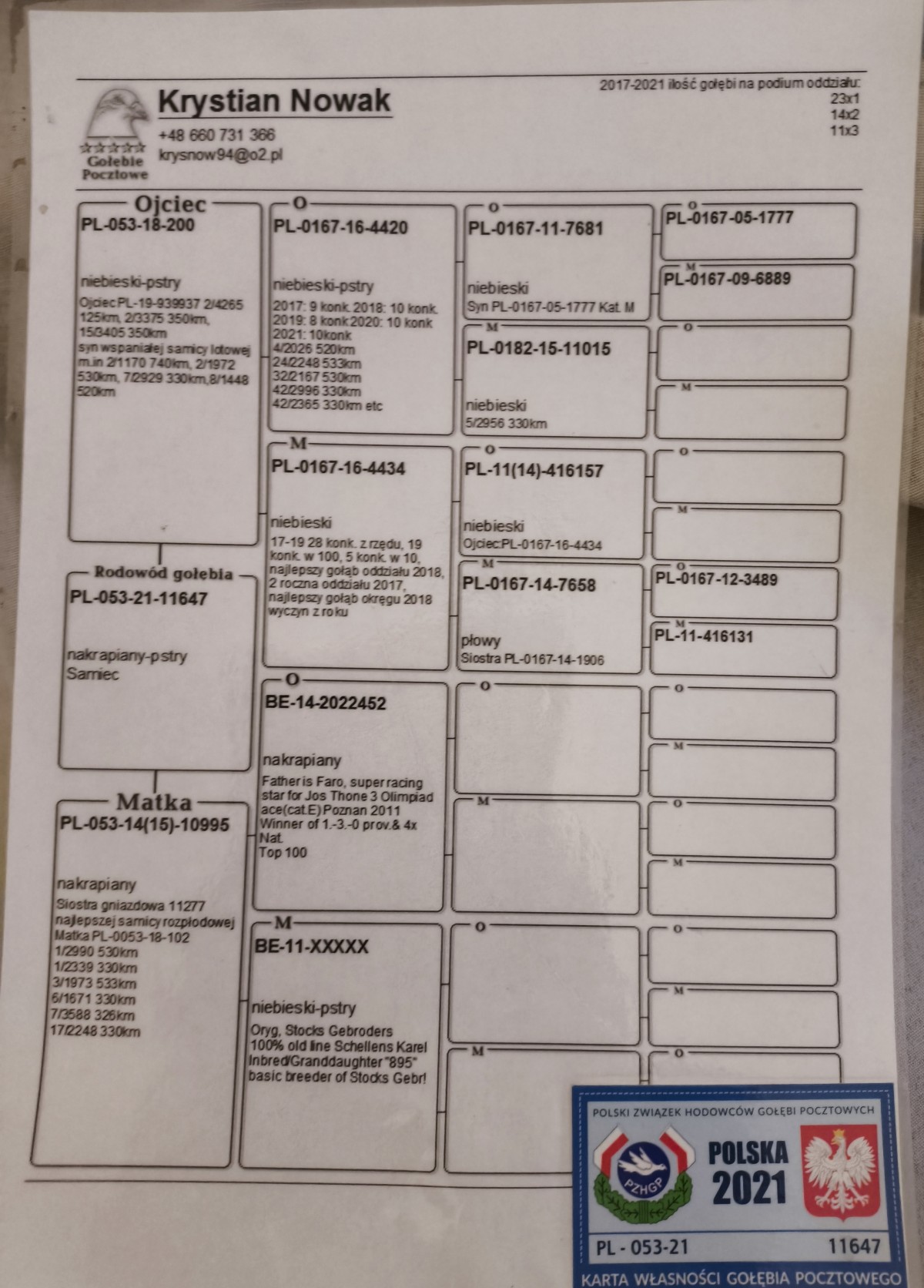 Oryg. Andrzej i Szymon Juskowscy Gołąb lotowany w koleżeńskiej rywalizacji na WG Gatka. Gołębie na tym gołębniku rywalizowały z gołębiami z Oddziału gdzie wywalczyły najwyższe wyniki. Gołębie zaliczyły 5 lotów w Oddziale i lot okręgowy 367 km. pod wiatr.