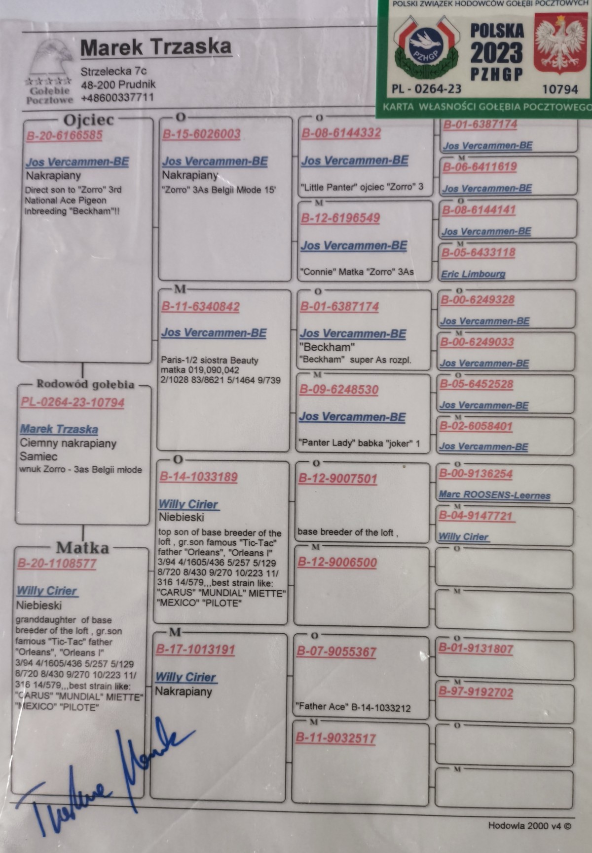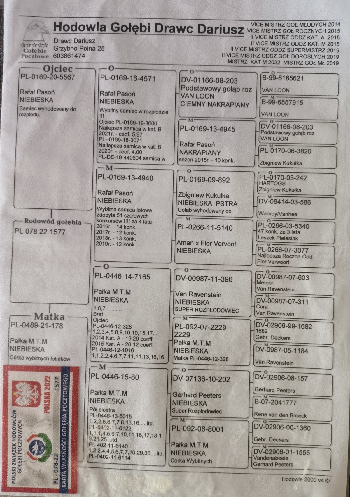 Oryg. Marek Kidoń Gołąb lotowany w koleżeńskiej rywalizacji na WG Gatka. Gołębie na tym gołębniku rywalizowały z gołębiami z Oddziału gdzie wywalczyły najwyższe wyniki. Gołębie zaliczyły 5 lotów w Oddziale i lot okręgowy 367 km. pod wiatr.