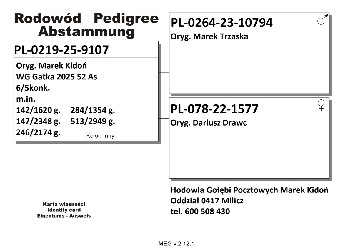 PL-0219-25-9107 - Oryg. Marek Kidoń Gołąb lotowany w koleżeńskiej rywalizacji na WG Gatka.