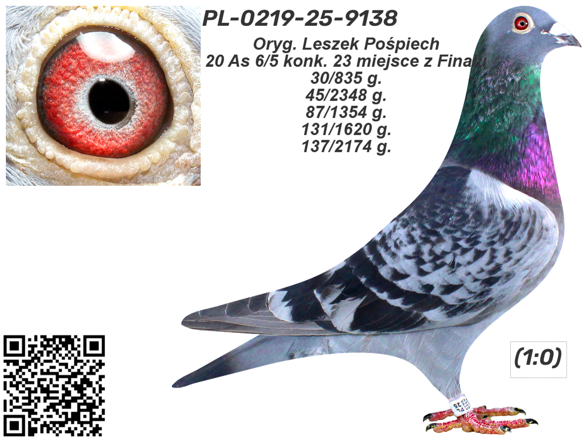 Oryg. Leszek Pośpiech Gołąb lotowany w koleżeńskiej rywalizacji na WG Gatka. Gołębie na tym gołębniku rywalizowały z gołębiami z Oddziału gdzie wywalczyły najwyższe wyniki. Gołębie zaliczyły 5 lotów w Oddziale i lot okręgowy 367 km. pod wiatr.