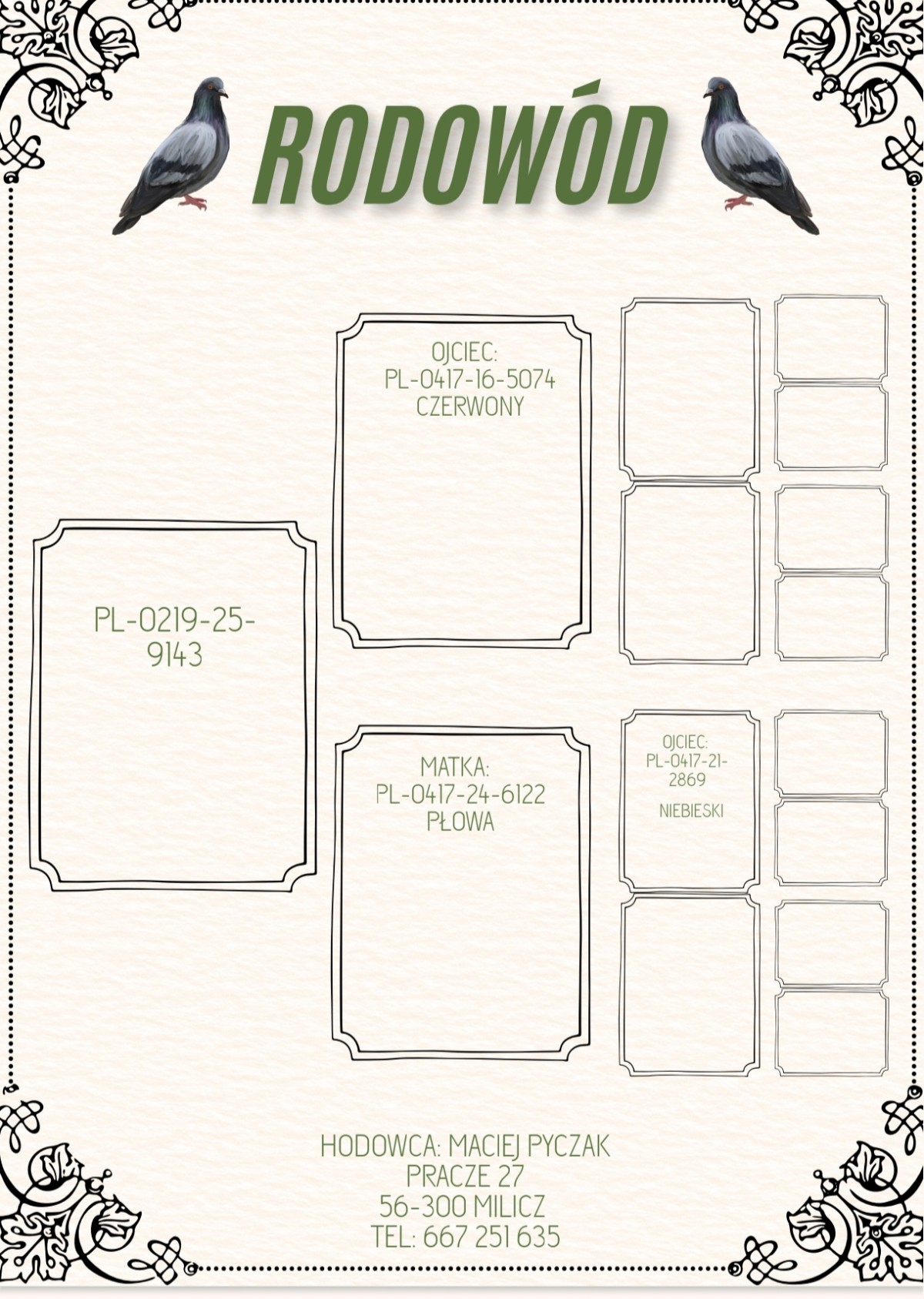 Płeć: samiec Hodowca - rasa: Stachowscy Katarzyna i Marek Zakończenie: 1.11.2025 godz. 20:24