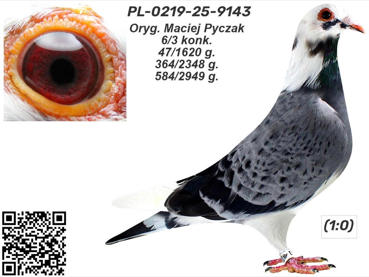 Oryg. Maciej Pyczak Gołąb lotowany w koleżeńskiej rywalizacji na WG Gatka. Gołębie na tym gołębniku rywalizowały z gołębiami z Oddziału gdzie wywalczyły najwyższe wyniki. Gołębie zaliczyły 5 lotów w Oddziale i lot okręgowy 367 km. pod wiatr.