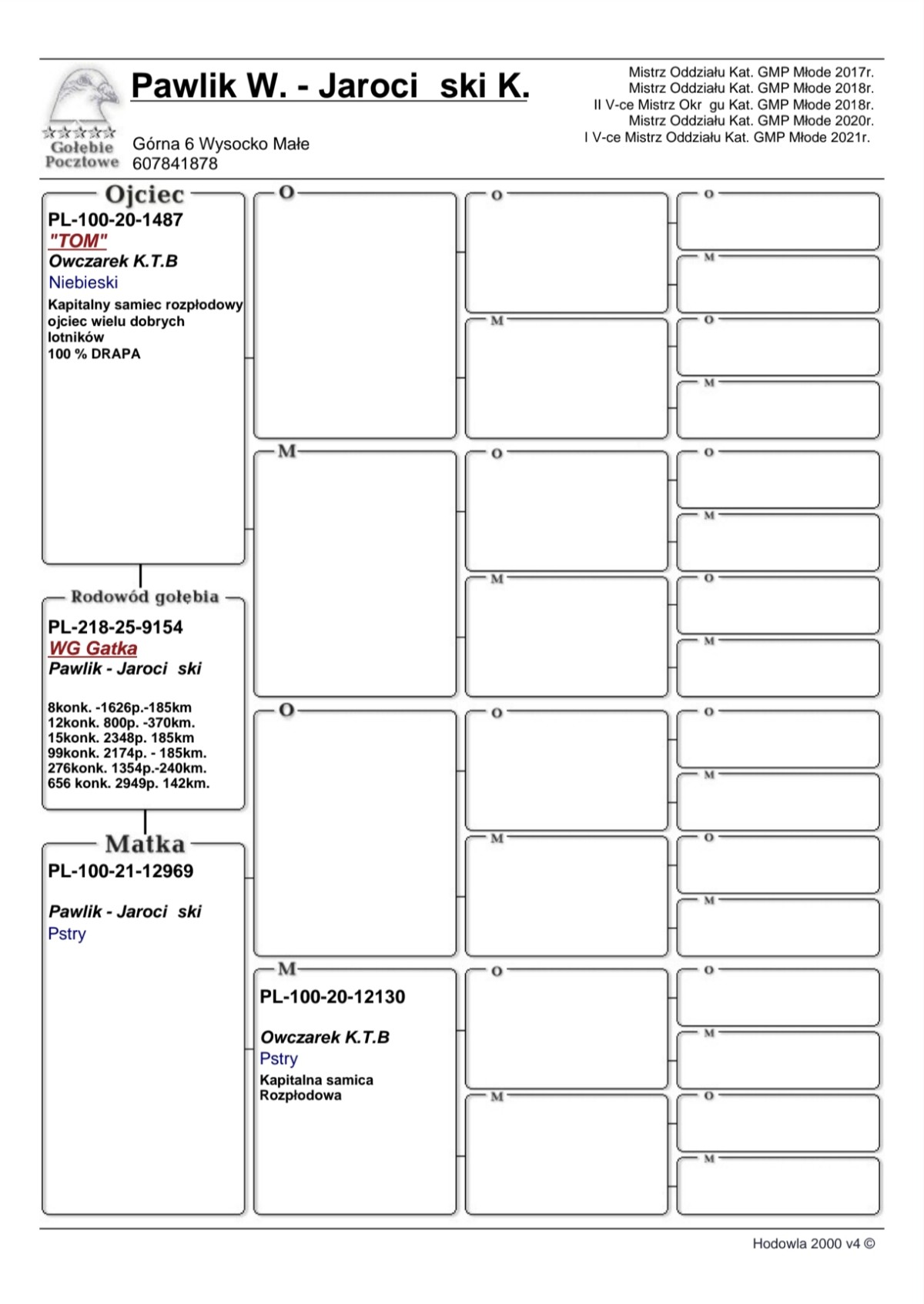 Oryg. Krzysztof Jarociński Gołąb lotowany w koleżeńskiej rywalizacji na WG Gatka. Gołębie na tym gołębniku rywalizowały z gołębiami z Oddziału gdzie wywalczyły najwyższe wyniki. Gołębie zaliczyły 5 lotów w Oddziale i lot okręgowy 367 km. pod wiatr.