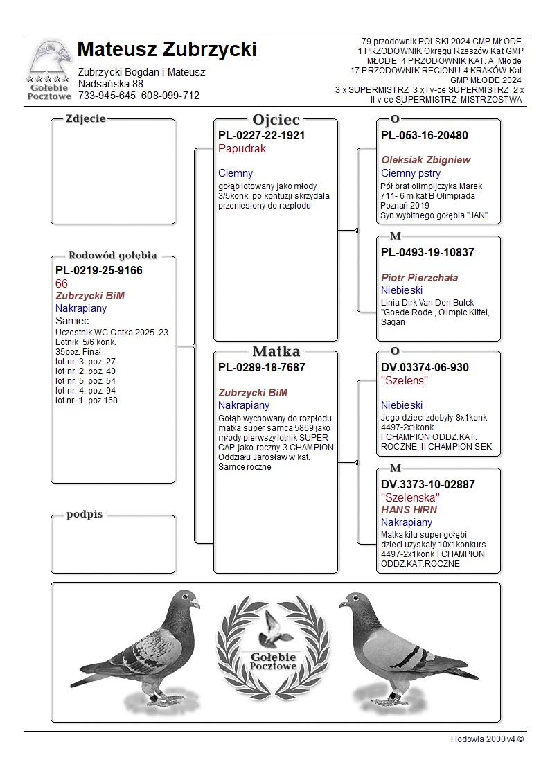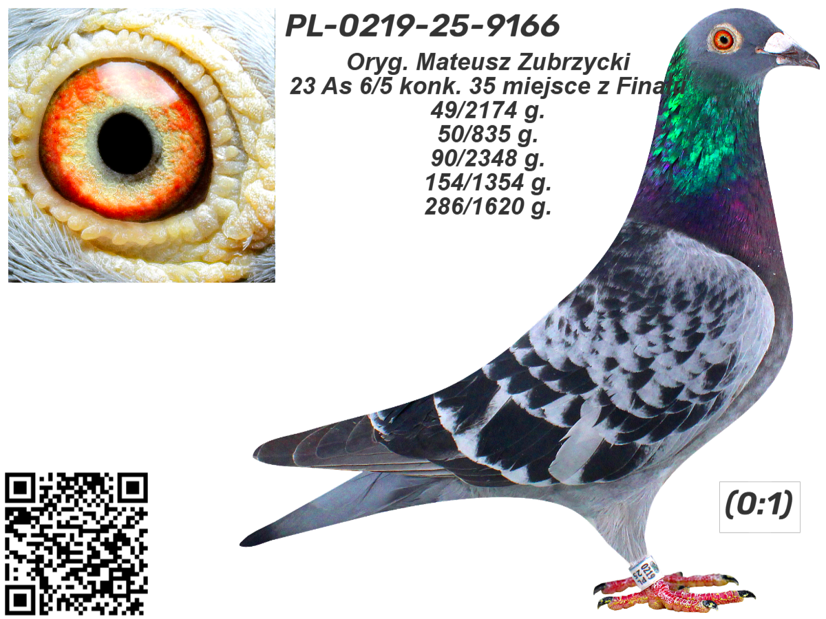Oryg. Mateusz Zubrzycki Gołąb lotowany w koleżeńskiej rywalizacji na WG Gatka. Gołębie na tym gołębniku rywalizowały z gołębiami z Oddziału gdzie wywalczyły najwyższe wyniki. Gołębie zaliczyły 5 lotów w Oddziale i lot okręgowy 367 km. pod wiatr.