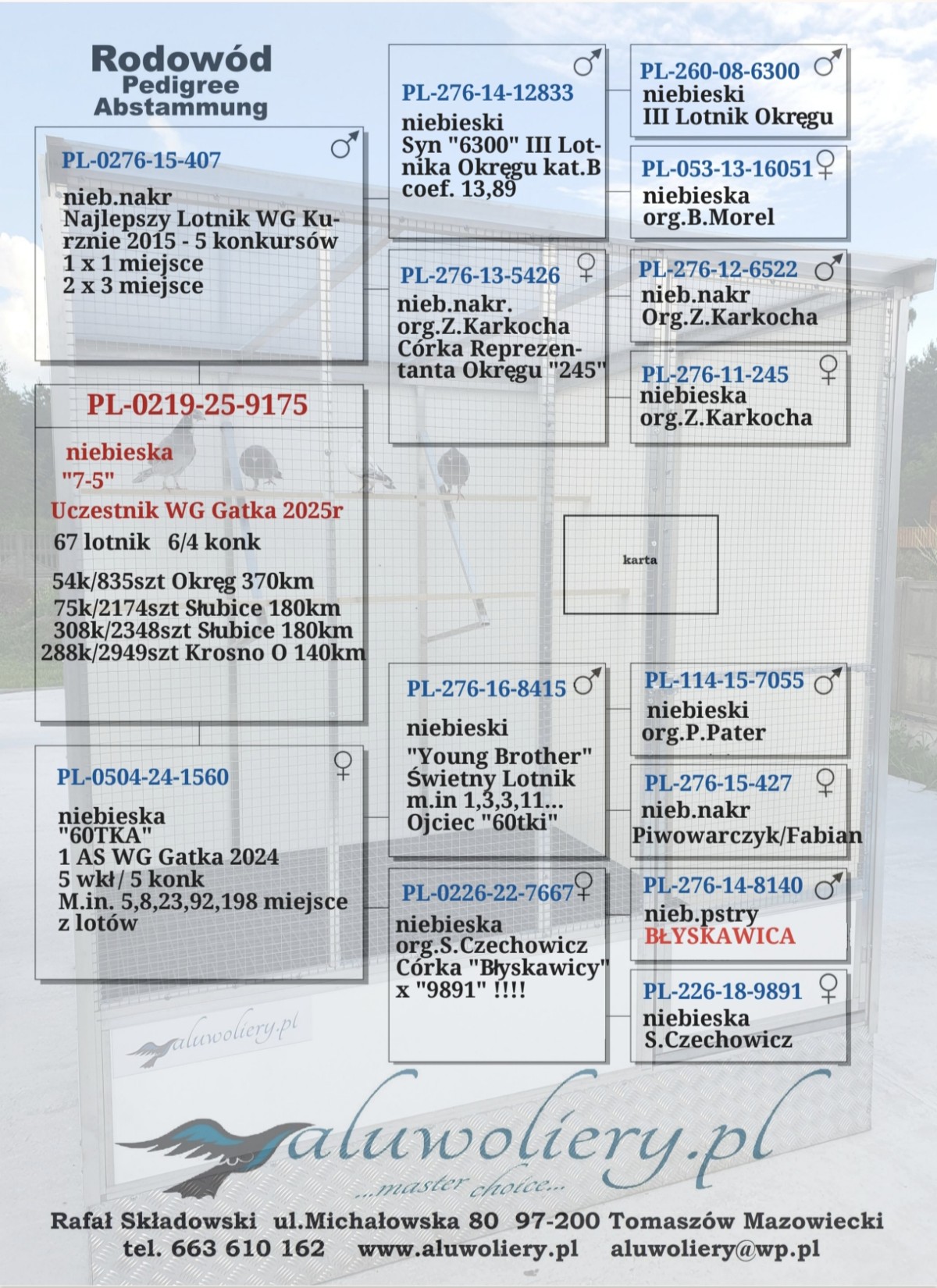 Oryg. Rafał Składowski Gołąb lotowany w koleżeńskiej rywalizacji na WG Gatka. Gołębie na tym gołębniku rywalizowały z gołębiami z Oddziału gdzie wywalczyły najwyższe wyniki. Gołębie zaliczyły 5 lotów w Oddziale i lot okręgowy 367 km. pod wiatr.
