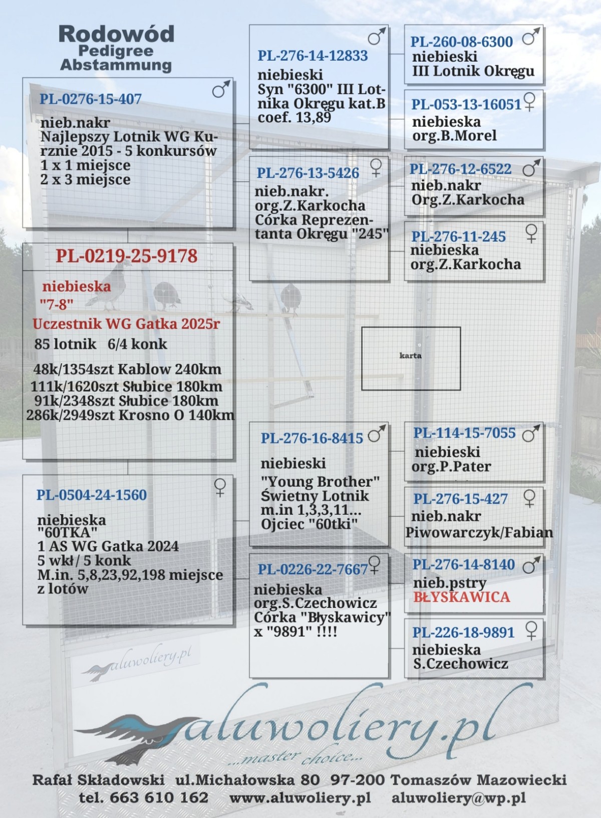 Oryg. Rafał Składowski Gołąb lotowany w koleżeńskiej rywalizacji na WG Gatka. Gołębie na tym gołębniku rywalizowały z gołębiami z Oddziału gdzie wywalczyły najwyższe wyniki. Gołębie zaliczyły 5 lotów w Oddziale i lot okręgowy 367 km. pod wiatr.