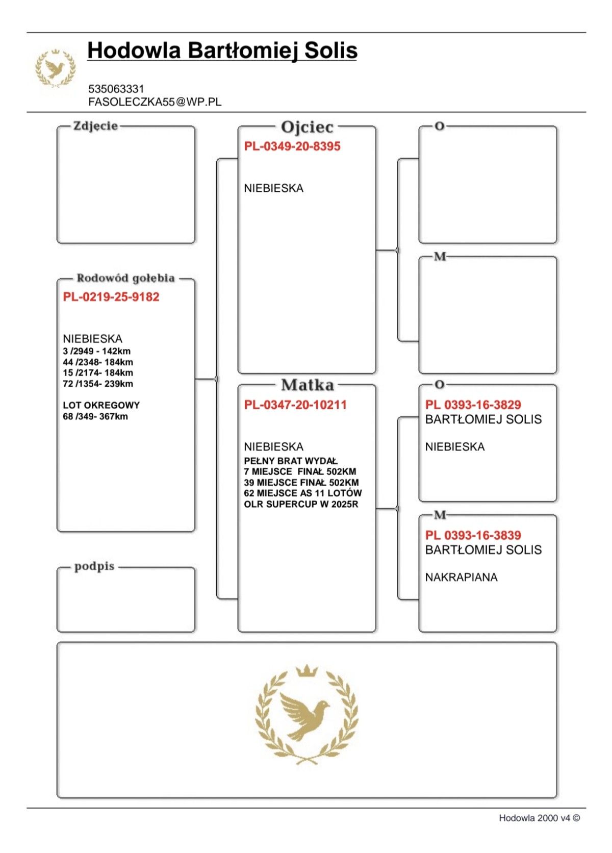 Oryg. Bartek Solis Gołąb lotowany w koleżeńskiej rywalizacji na WG Gatka. Gołębie na tym gołębniku rywalizowały z gołębiami z Oddziału gdzie wywalczyły najwyższe wyniki. Gołębie zaliczyły 5 lotów w Oddziale i lot okręgowy 367 km. pod wiatr.