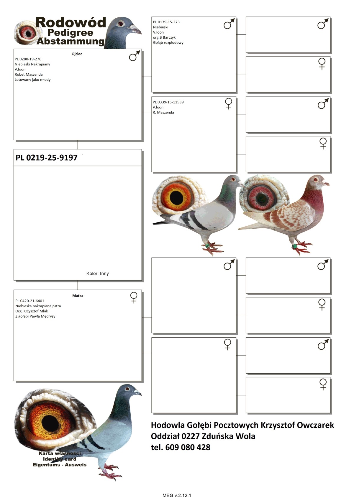 Oryg. Krzysztof Owczarek Gołąb lotowany w koleżeńskiej rywalizacji na WG Gatka. Gołębie na tym gołębniku rywalizowały z gołębiami z Oddziału gdzie wywalczyły najwyższe wyniki. Gołębie zaliczyły 5 lotów w Oddziale i lot okręgowy 367 km. pod wiatr.