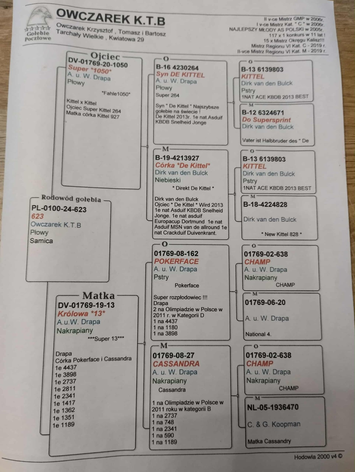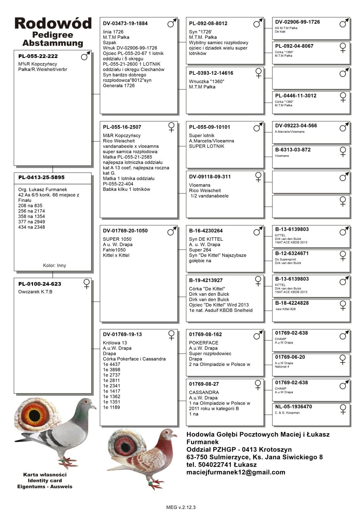 Oryg. Łukasz Furmanek Gołąb lotowany w koleżeńskiej rywalizacji na WG Gatka. Gołębie na tym gołębniku rywalizowały z gołębiami z Oddziału gdzie wywalczyły najwyższe wyniki. Gołębie zaliczyły 5 lotów w Oddziale i lot okręgowy 367 km. pod wiatr.