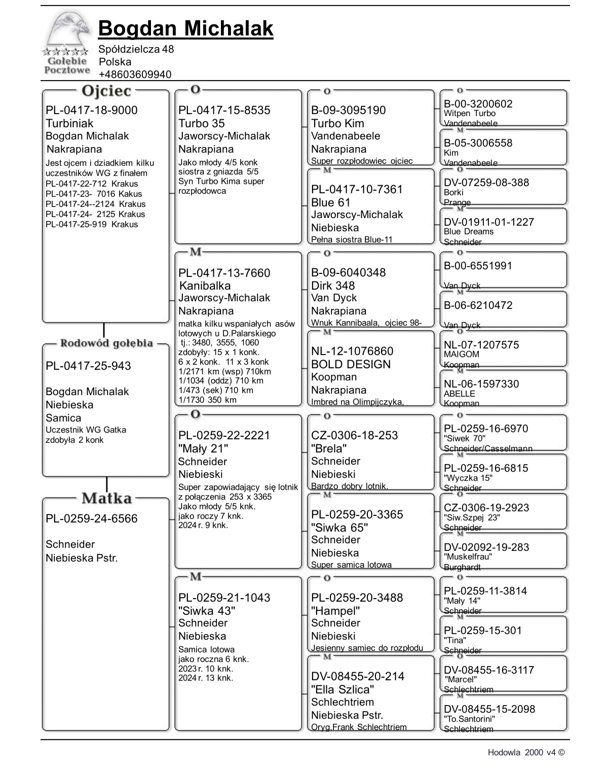 oryg. Bogdan Michalak Gołąb lotowany w koleżeńskiej rywalizacji na WG Gatka. Gołębie na tym gołębniku rywalizowały z gołębiami z Oddziału gdzie wywalczyły najwyższe wyniki. Gołębie zaliczyły 5 lotów w Oddziale i lot okręgowy 367 km. pod wiatr.