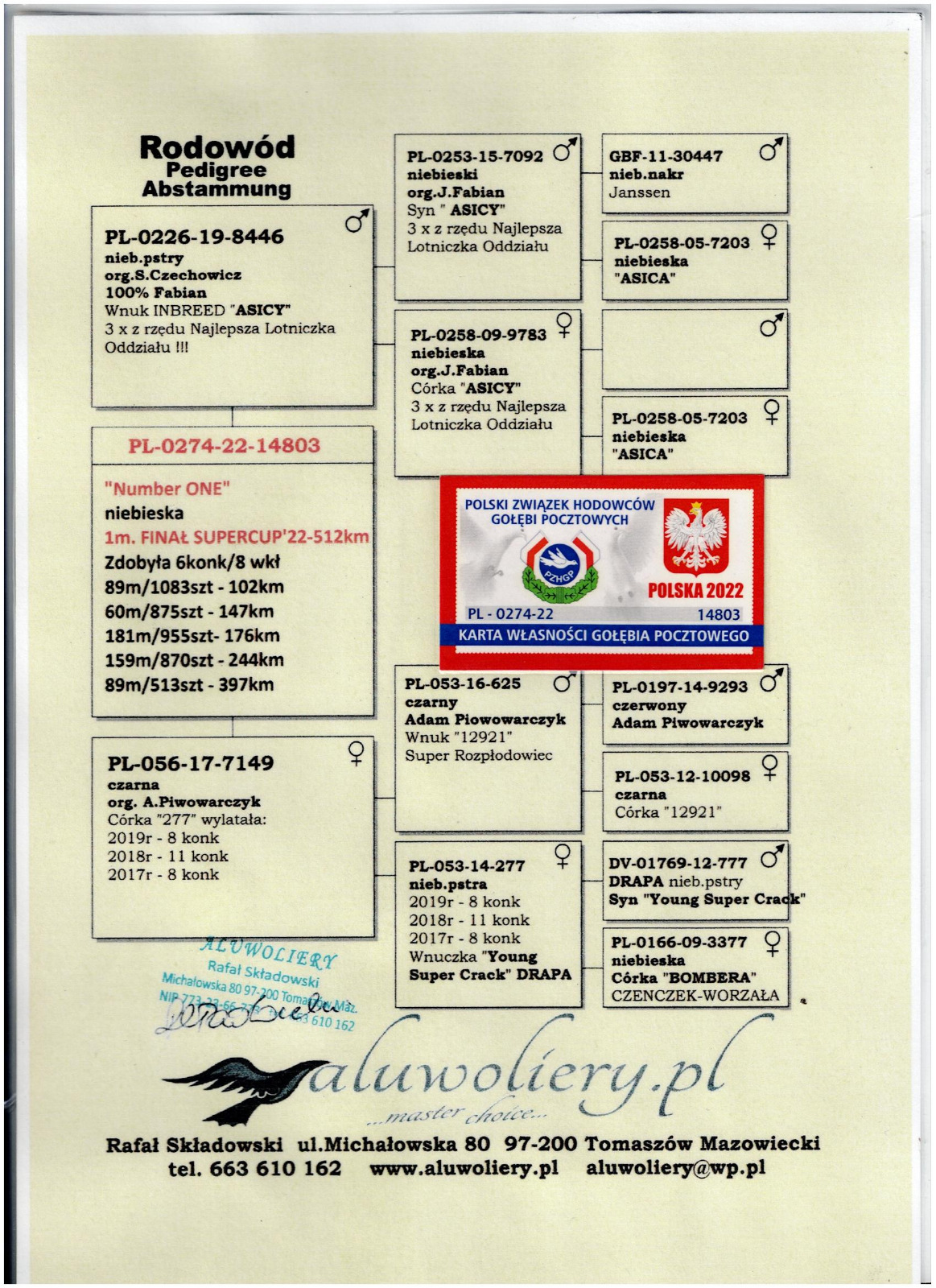 Oryg. Paweł Gembrowicz Gołąb lotowany w koleżeńskiej rywalizacji na WG Gatka. Gołębie na tym gołębniku rywalizowały z gołębiami z Oddziału gdzie wywalczyły najwyższe wyniki. Gołębie zaliczyły 5 lotów w Oddziale i lot okręgowy 367 km. pod wiatr.