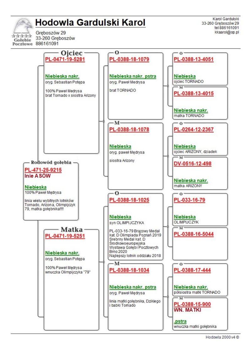 PL-0471-25-9215 - 100% P. Mędrysa linia Olimp. 79, matki Gołębnika, Tornado, Arizona