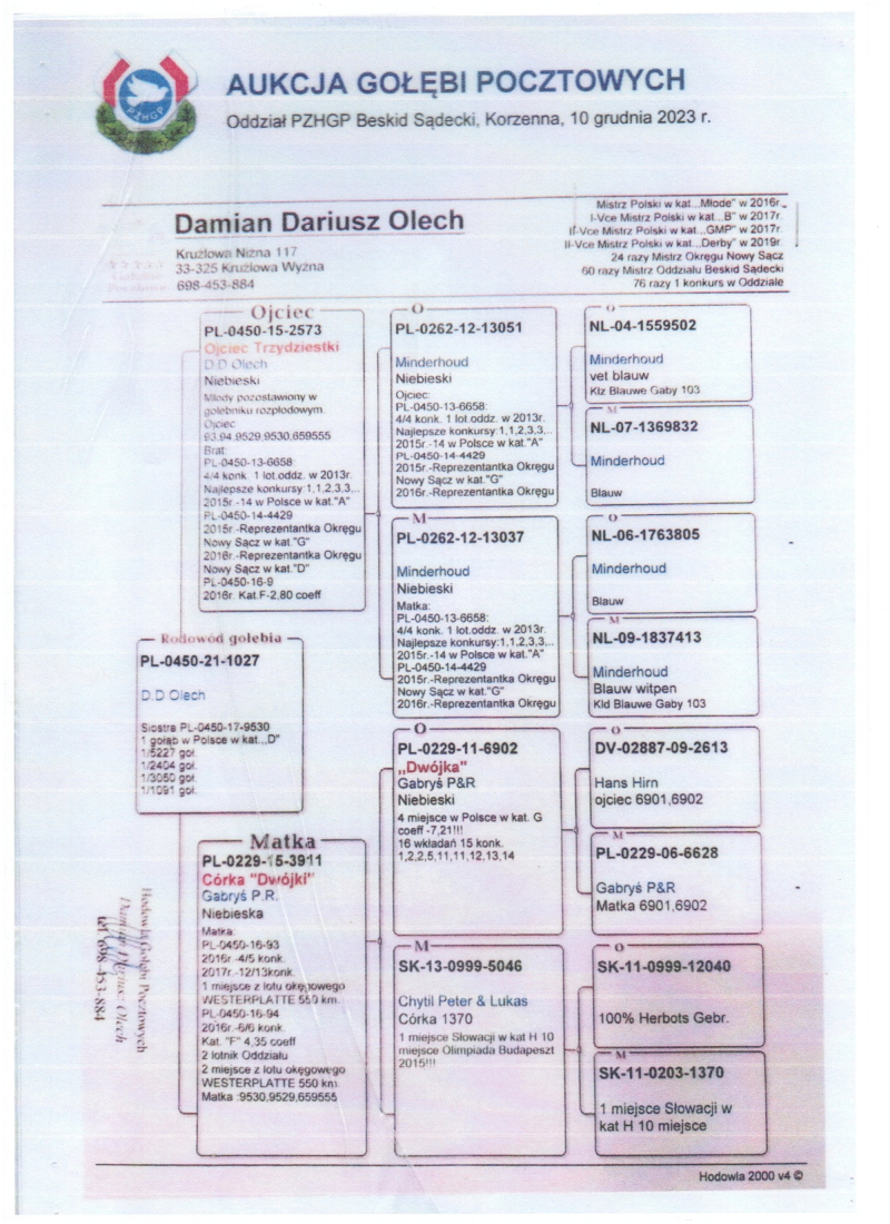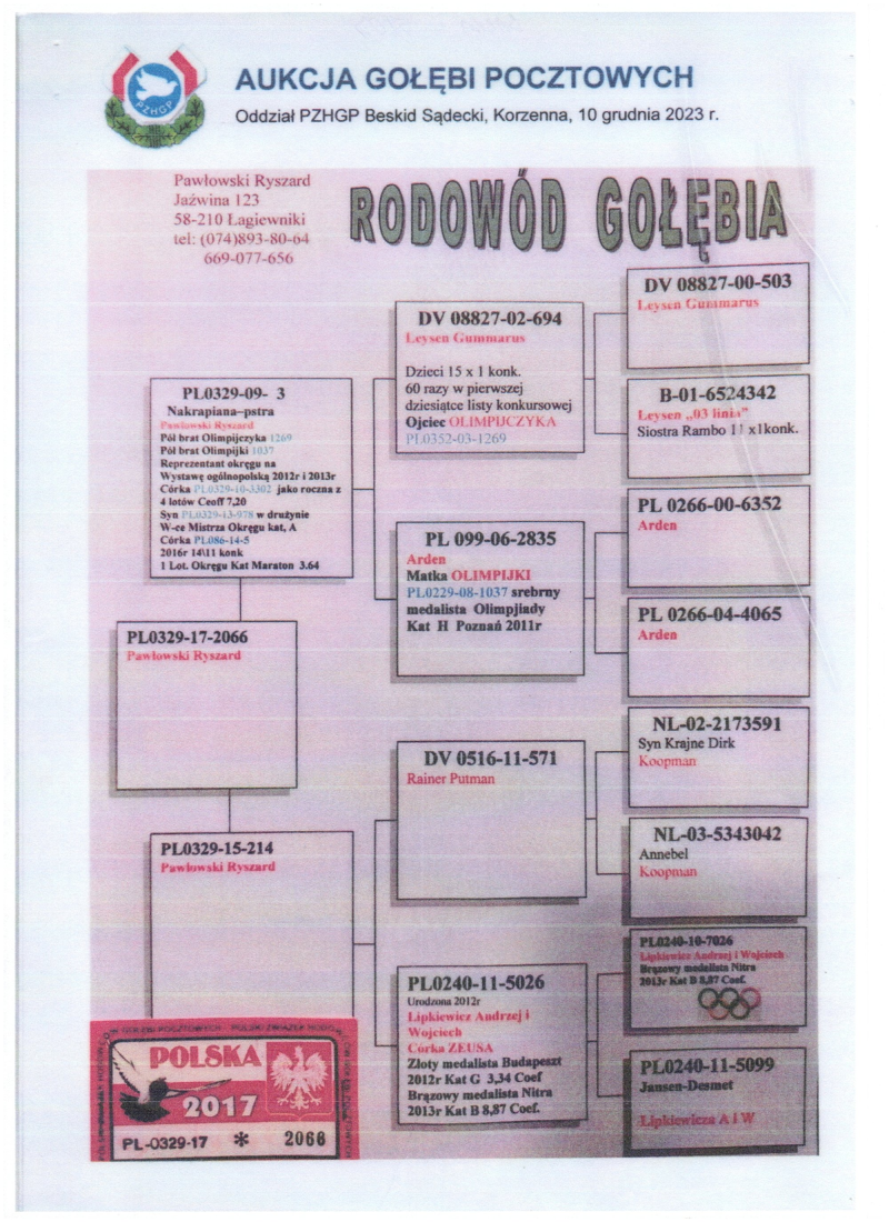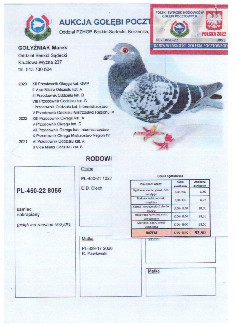 Płeć: samiec Hodowca - rasa: Oryg.ZIELIŃSKI MARIAN Zakończenie: 28.10.2025 godz. 21:09