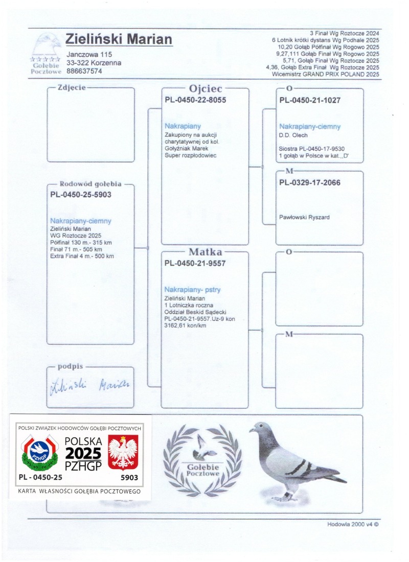 PL-0450-25-5903 WG ROZTOCZE FINAŁ 71poz.505km Extra Finał 4poz.!!! 500km 31AS Dalekodystansowy 35Drużyna 2x500km