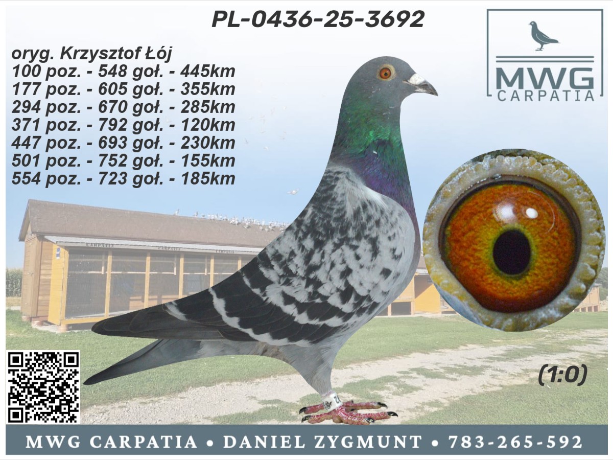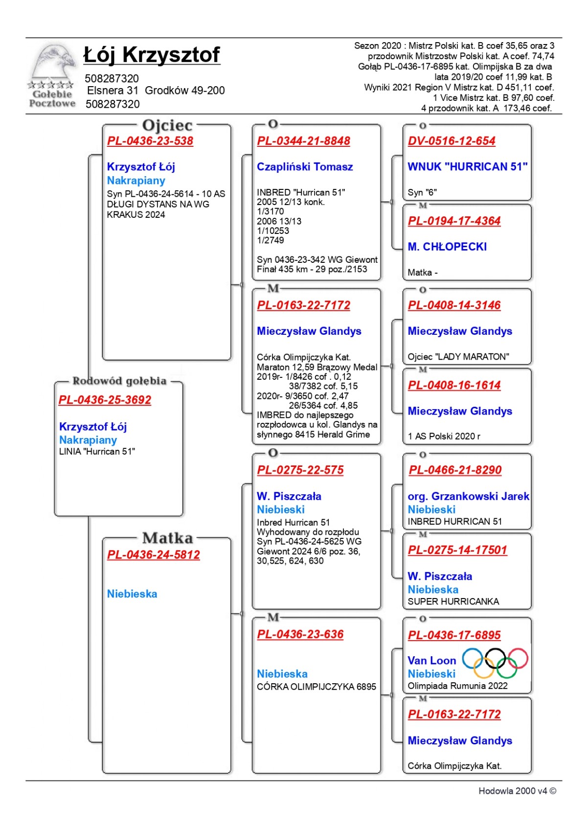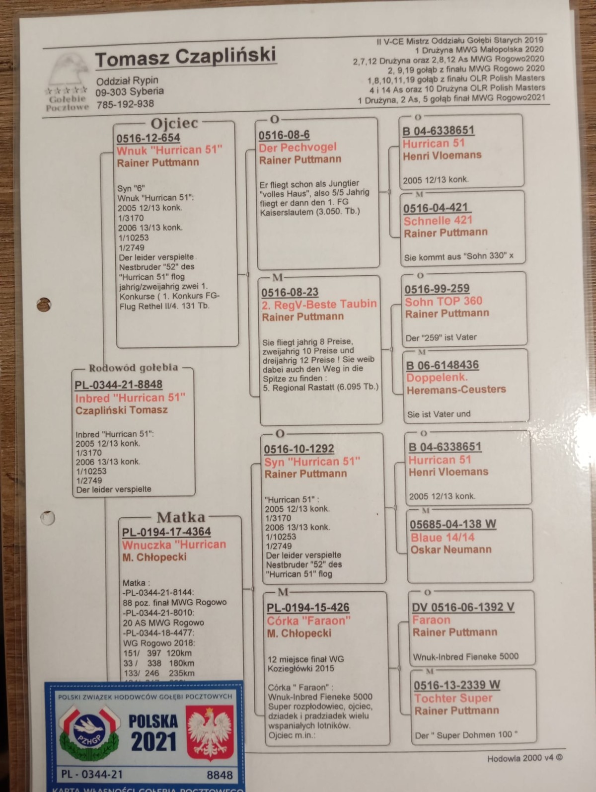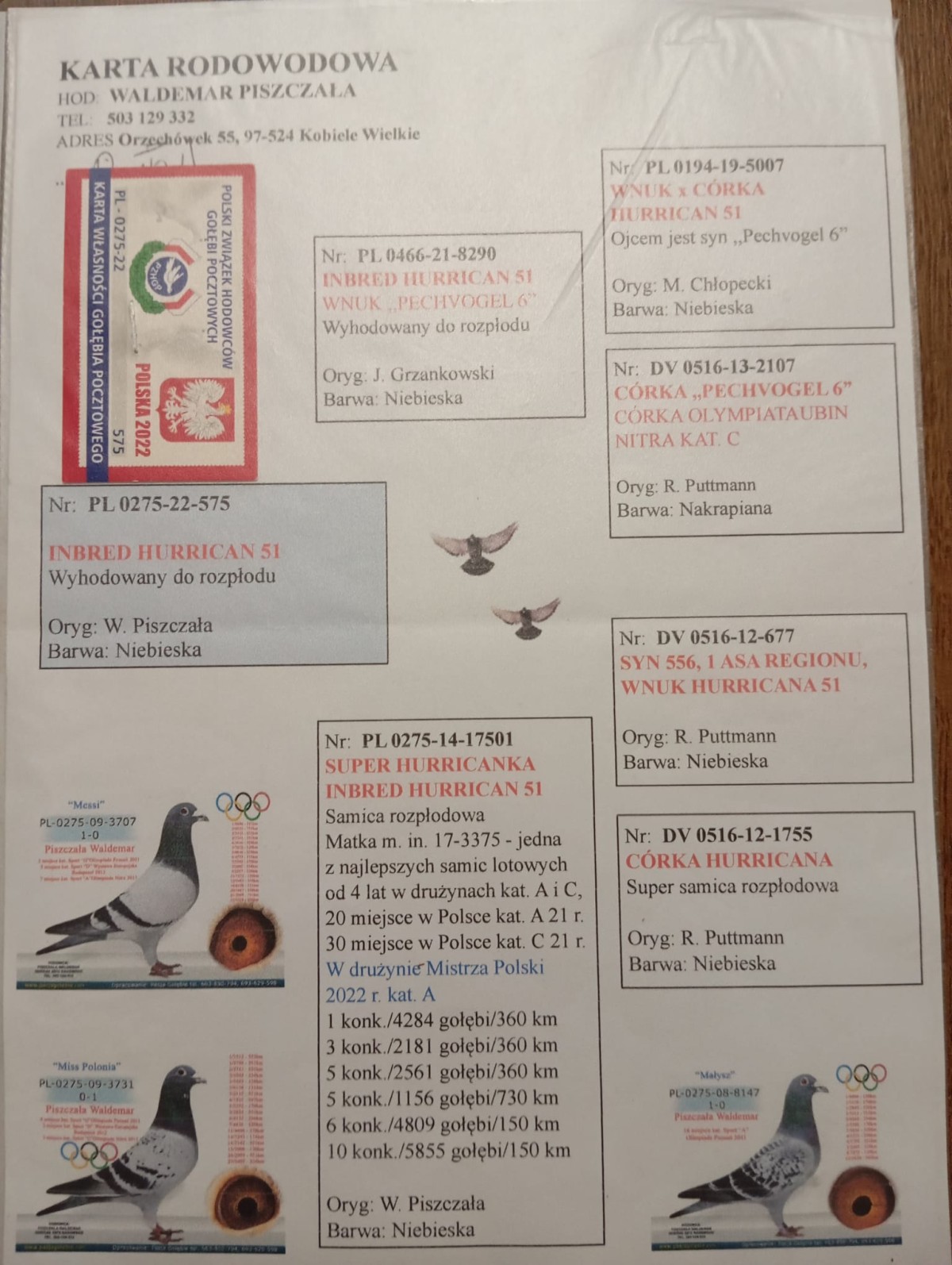 | Lot | Data | Dystans [km] | Ilość gołębi | Pozycja | Prędkość [m/min] |