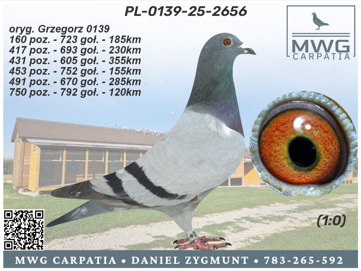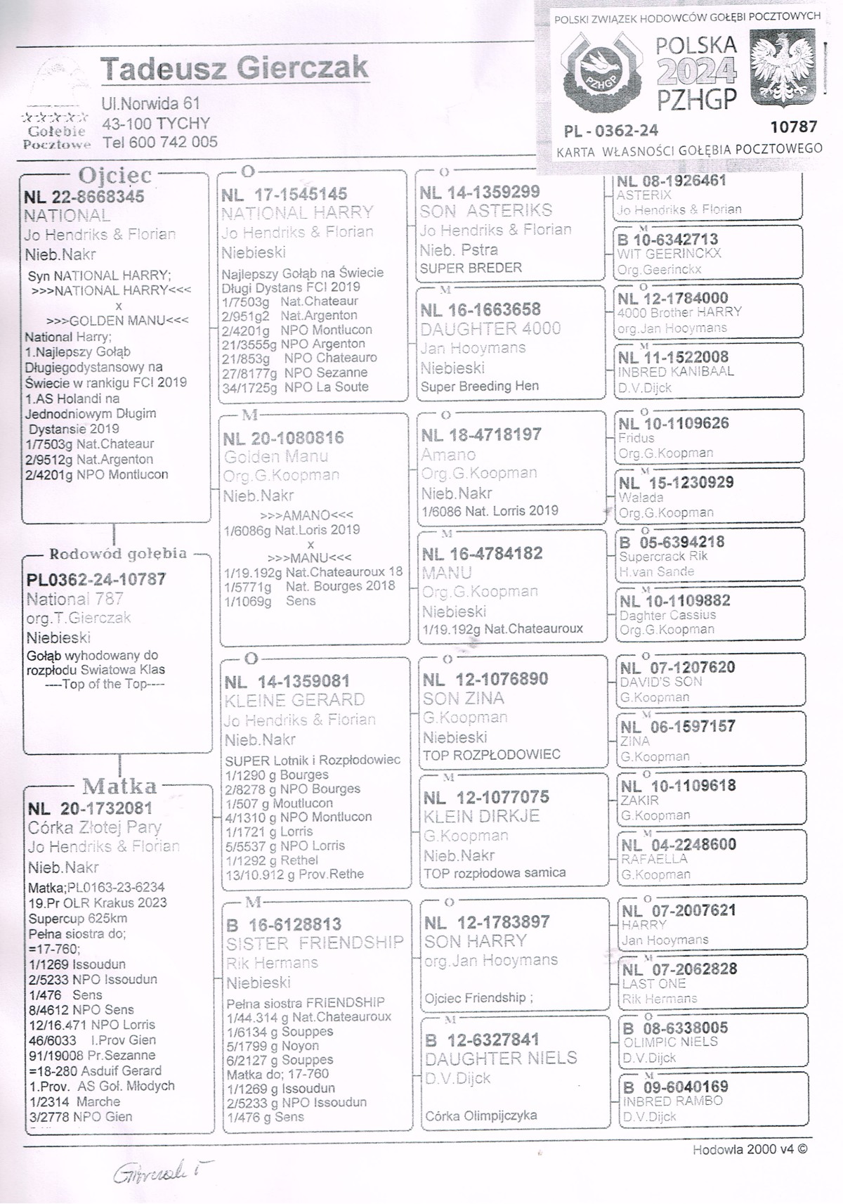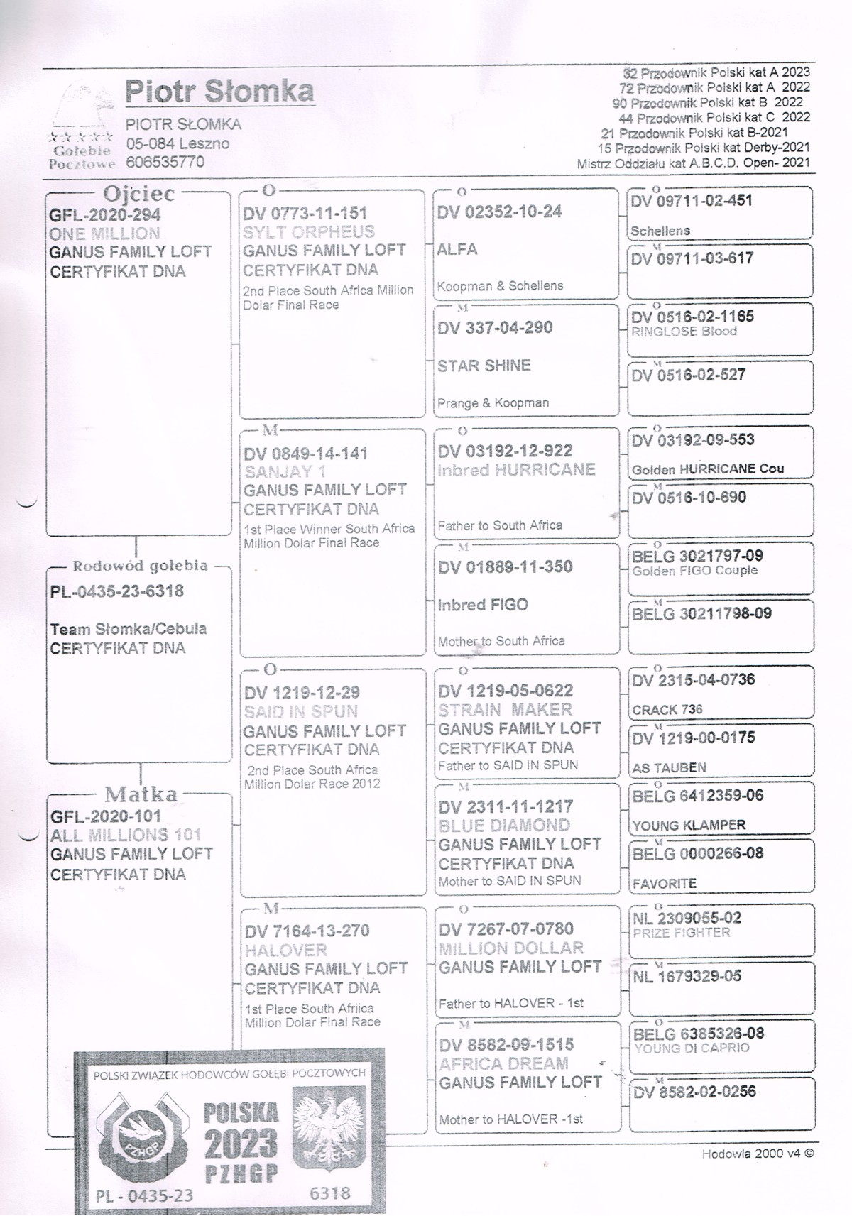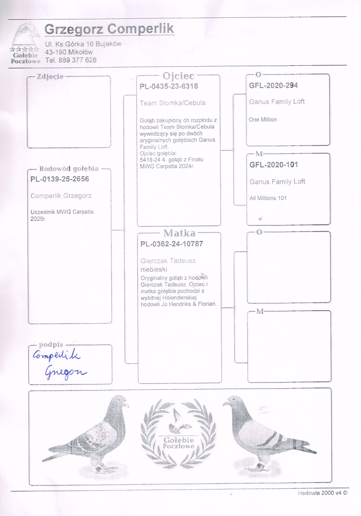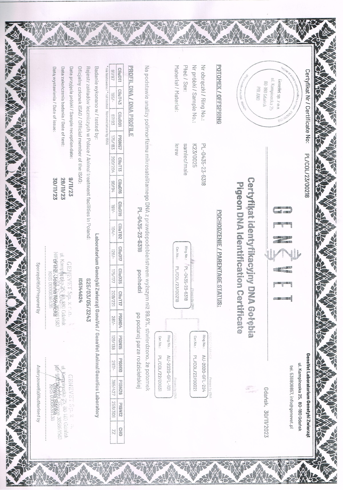 | Lot | Data | Dystans [km] | Ilość gołębi | Pozycja | Prędkość [m/min] |
