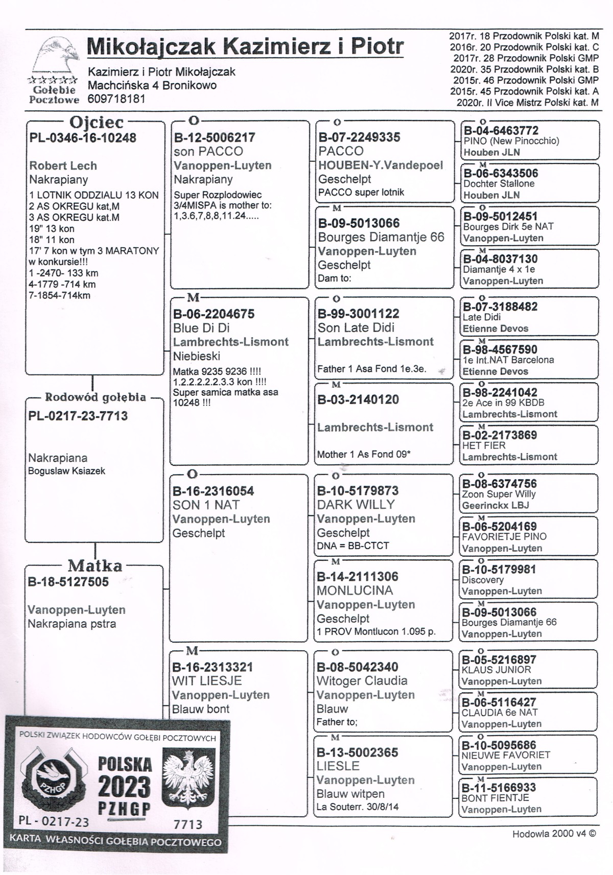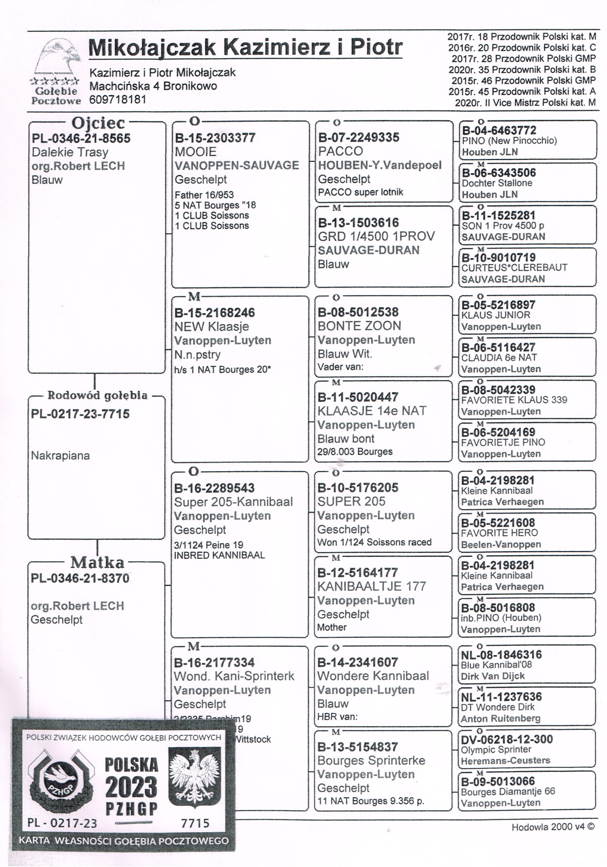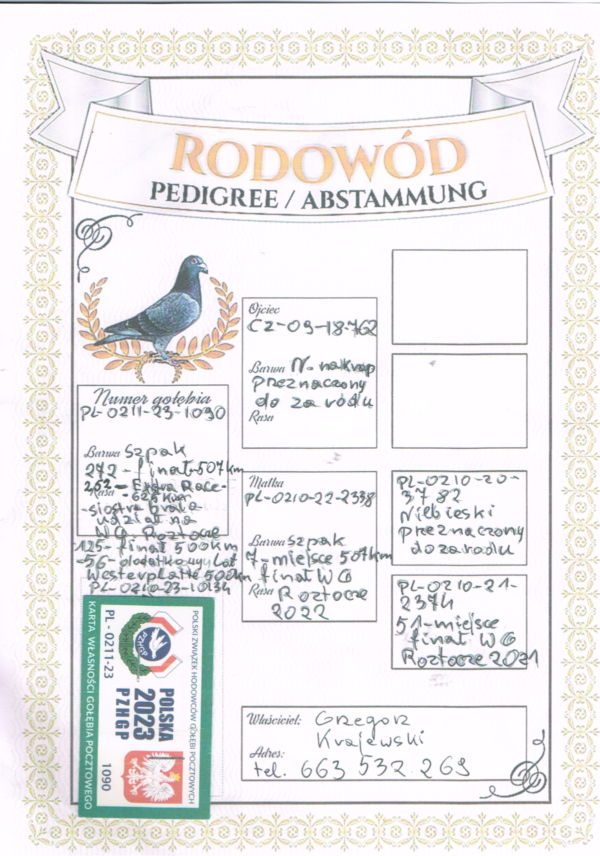| Lot | Data | Dystans [km] | Ilość gołębi | Pozycja | Prędkość [m/min] |