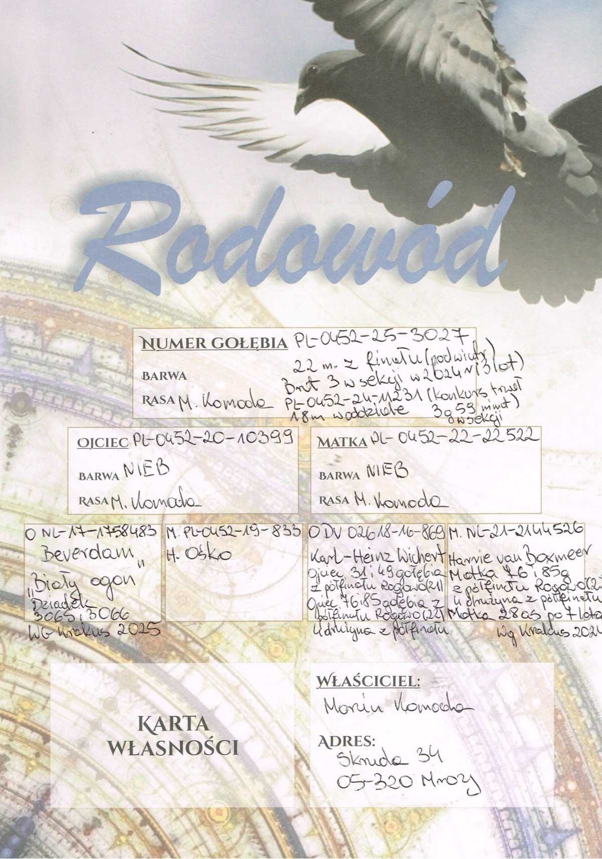Lot | Data | Dystans [km] | Ilość gołębi | Pozycja | Prędkość [m/min] |