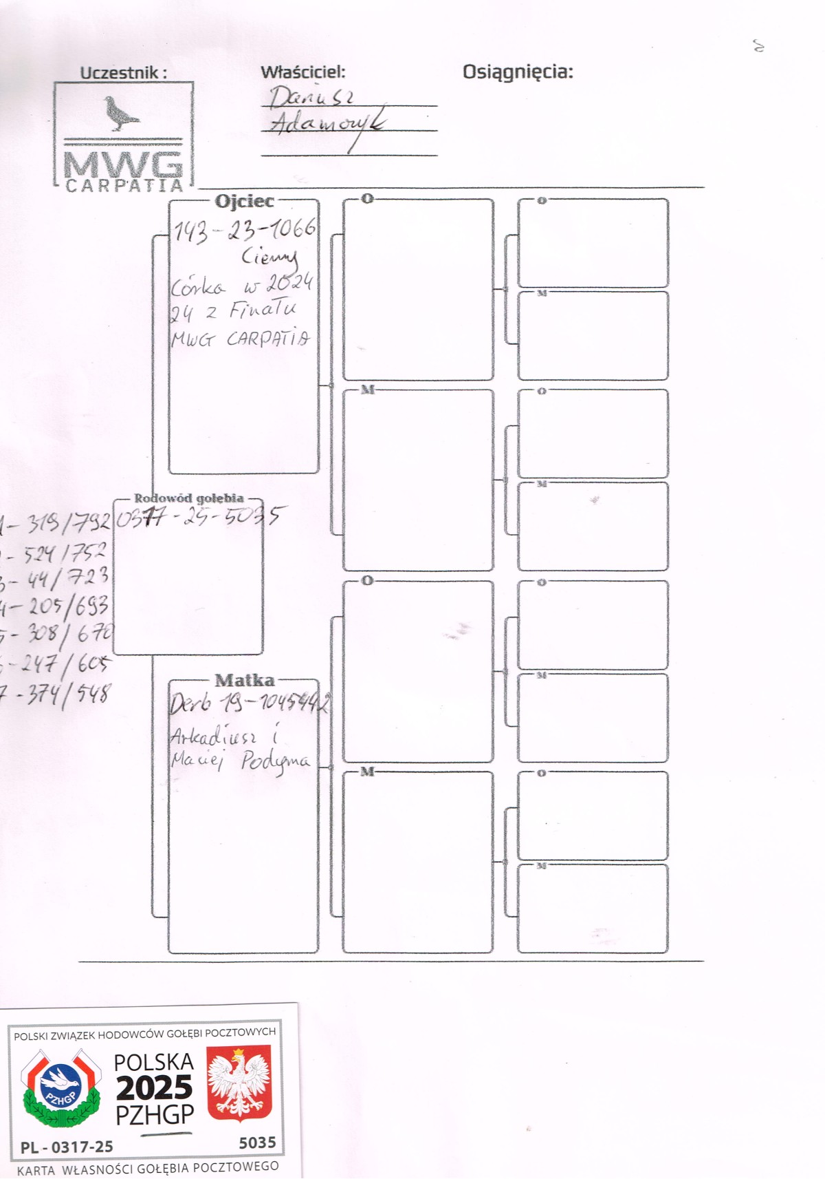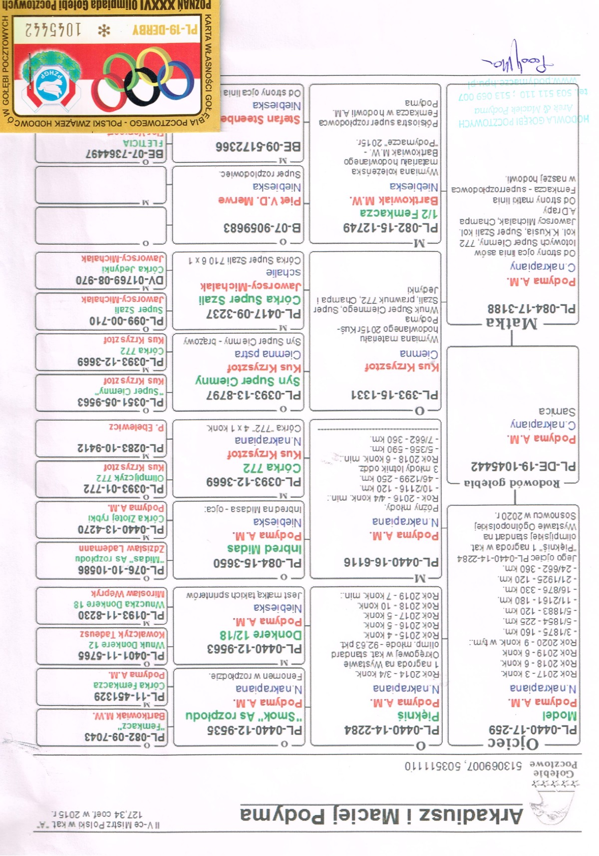 | Lot | Data | Dystans [km] | Ilość gołębi | Pozycja | Prędkość [m/min] |