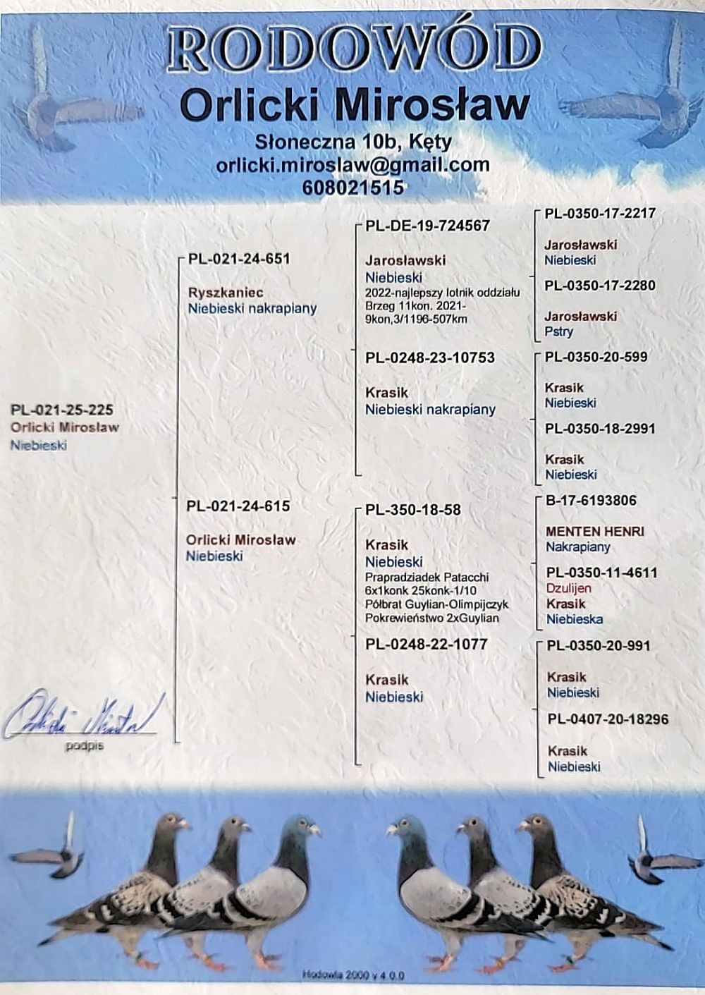 Mirosław Orlicki, 381 miejsce w klasyfikacji AS, 155 z finału, 71 z ekstra finału Gołąb uczestniczył w rywalizacji na WG Zatoka Puck 2025. Szczegóły pochodzenia w rodowodzie i załączonych materiałach. Wyniki lotowe w tabeli. Gołąb posiada tylko te materiały, które są widoczne na aukcji (karta własności, rodowód itp). Gołębie po zakończonej aukcji zostaną rozwiezione przez organizatora WG (koszt 150-200 zł w zależności od ilości gołębi i odległości), możliwy jest odbiór osobisty. Więcej informacji pod nr tel.: 503 164 320