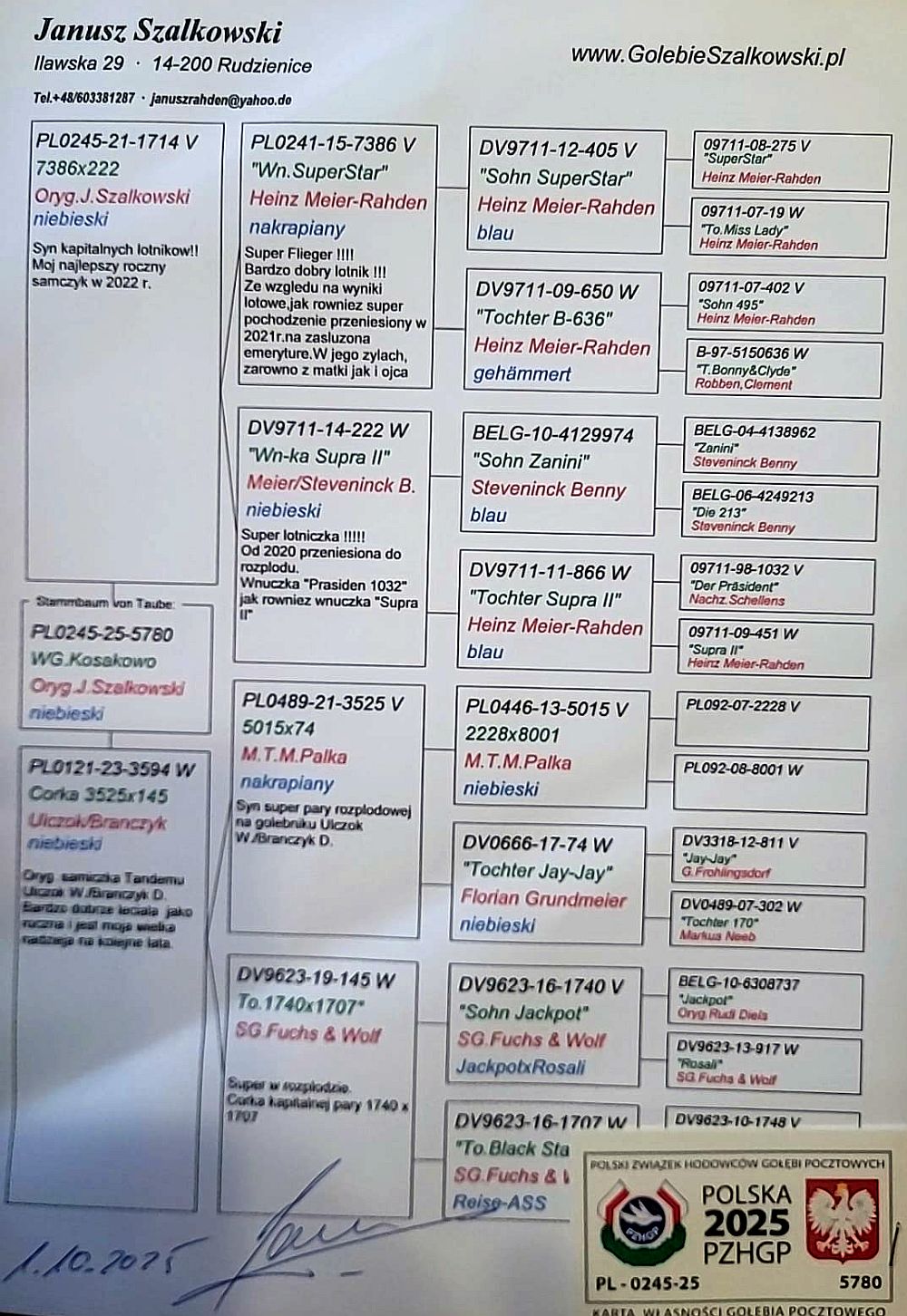 Lot | Data | Dystans [km] | Ilość gołębi | Pozycja | Prędkość [m/min] |