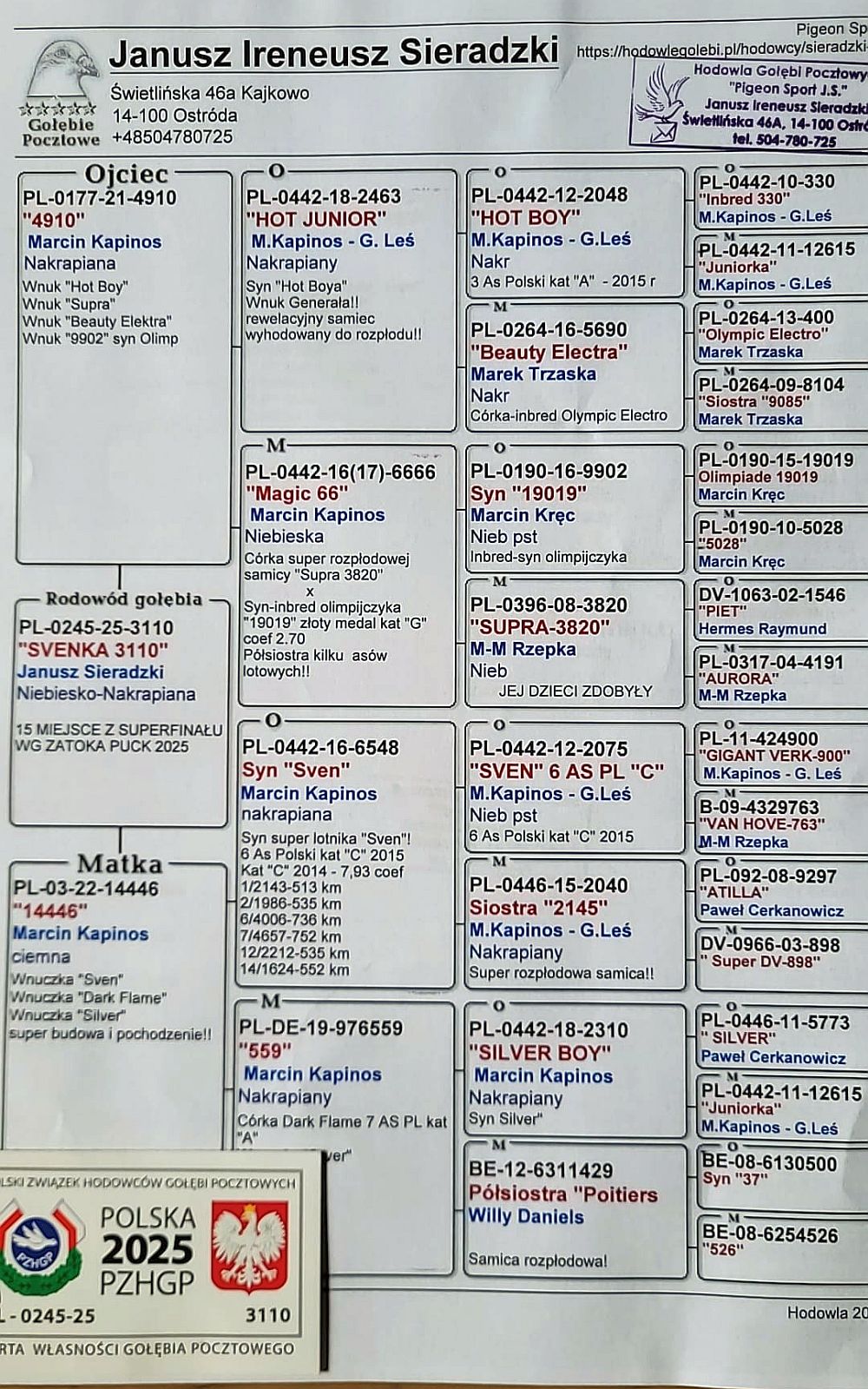 Lot | Data | Dystans [km] | Ilość gołębi | Pozycja | Prędkość [m/min] |