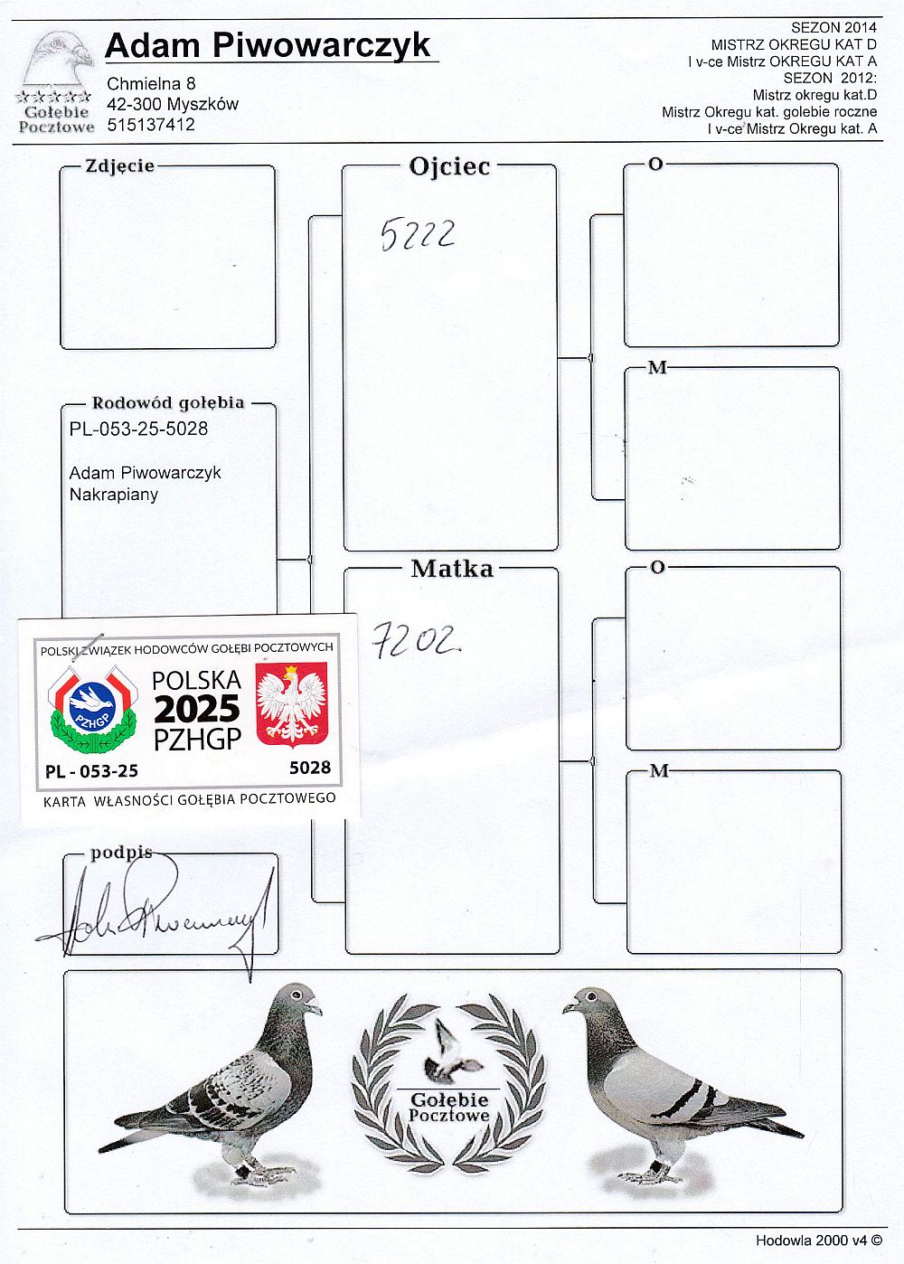 Adam Piwowarczyk, 344 miejsce w klasyfikacji AS Gołąb uczestniczył w rywalizacji na WG Zatoka Puck 2025. Szczegóły pochodzenia w rodowodzie i załączonych materiałach. Wyniki lotowe w tabeli. Gołąb posiada tylko te materiały, które są widoczne na aukcji (karta własności, rodowód itp). Gołębie po zakończonej aukcji zostaną rozwiezione przez organizatora WG (koszt 150-200 zł w zależności od ilości gołębi i odległości), możliwy jest odbiór osobisty. Więcej informacji pod nr tel.: 503 164 320