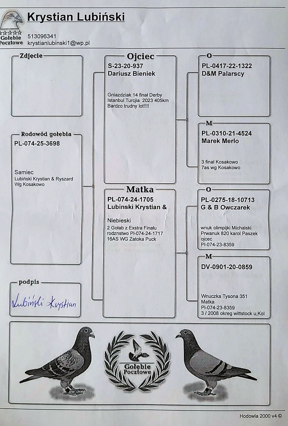 Opis: Team Lubiński, 235 miejsce w klasyfikacji AS, 127 z finału, 114 z ekstra finału Gołąb uczestniczył w rywalizacji na WG Zatoka Puck 2025. Szczegóły pochodzenia w rodowodzie i załączonych materiałach. Wyniki lotowe w tabeli. Gołąb posiada tylko te materiały, które są widoczne na aukcji (karta własności, rodowód itp). Gołębie po zakończonej aukcji zostaną rozwiezione przez organizatora WG (koszt 150-200 zł w zależności od ilości gołębi i odległości), możliwy jest odbiór osobisty. Więcej informacji pod nr tel.: 503 164 320