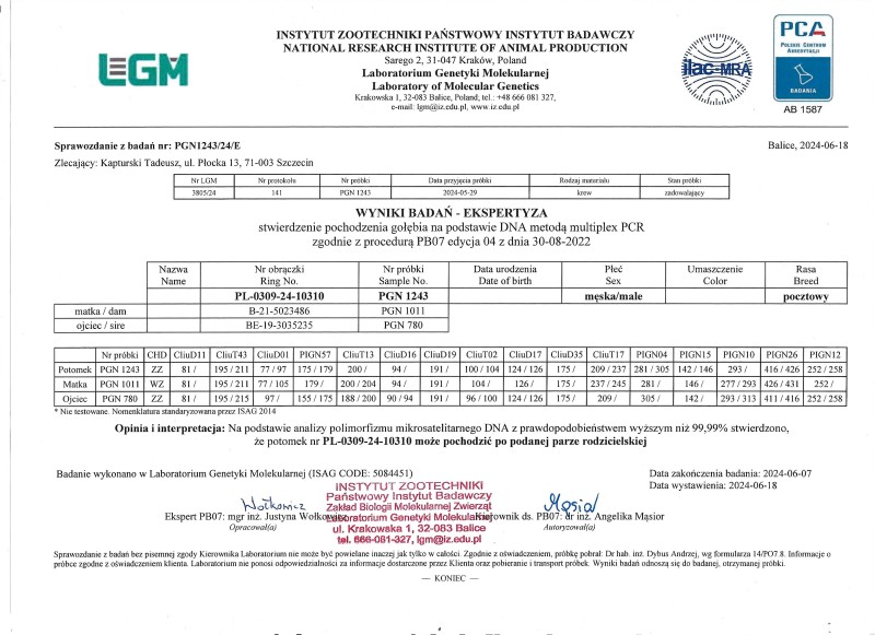 Płeć: samiec Hodowca - rasa: oryg. Tadeusz Kapturski Zakończenie: 28.10.2025 godz. 17:45