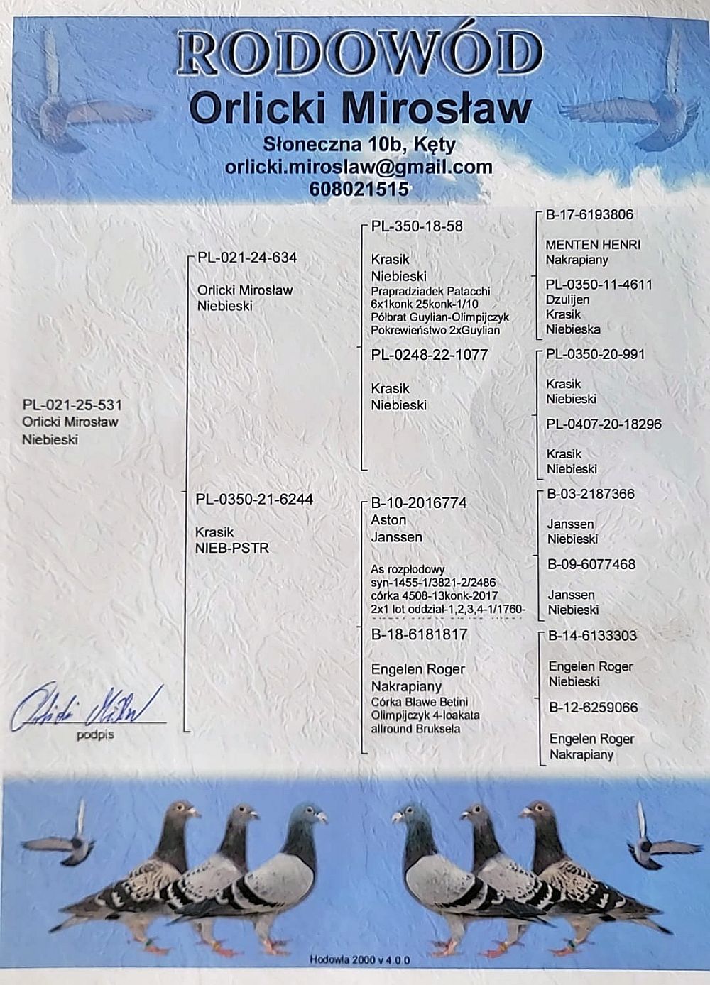 Mirosław Orlicki 2, 357 miejsce w klasyfikacji AS, 70 z finału, 47 z ekstra finału Gołąb uczestniczył w rywalizacji na WG Zatoka Puck 2025. Szczegóły pochodzenia w rodowodzie i załączonych materiałach. Wyniki lotowe w tabeli. Gołąb posiada tylko te materiały, które są widoczne na aukcji (karta własności, rodowód itp). Gołębie po zakończonej aukcji zostaną rozwiezione przez organizatora WG (koszt 150-200 zł w zależności od ilości gołębi i odległości), możliwy jest odbiór osobisty. Więcej informacji pod nr tel.: 503 164 320