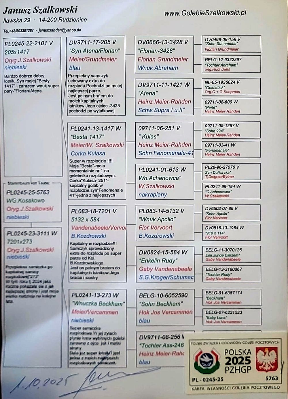 Teresa Szalkowska, 29 miejsce w klasyfikacji AS, 11 z finału, 105 z ekstra finału Gołąb uczestniczył w rywalizacji na WG Zatoka Puck 2025. Szczegóły pochodzenia w rodowodzie i załączonych materiałach. Wyniki lotowe w tabeli. Gołąb posiada tylko te materiały, które są widoczne na aukcji (karta własności, rodowód itp). Gołębie po zakończonej aukcji zostaną rozwiezione przez organizatora WG (koszt 150-200 zł w zależności od ilości gołębi i odległości), możliwy jest odbiór osobisty. Więcej informacji pod nr tel.: 503 164 320