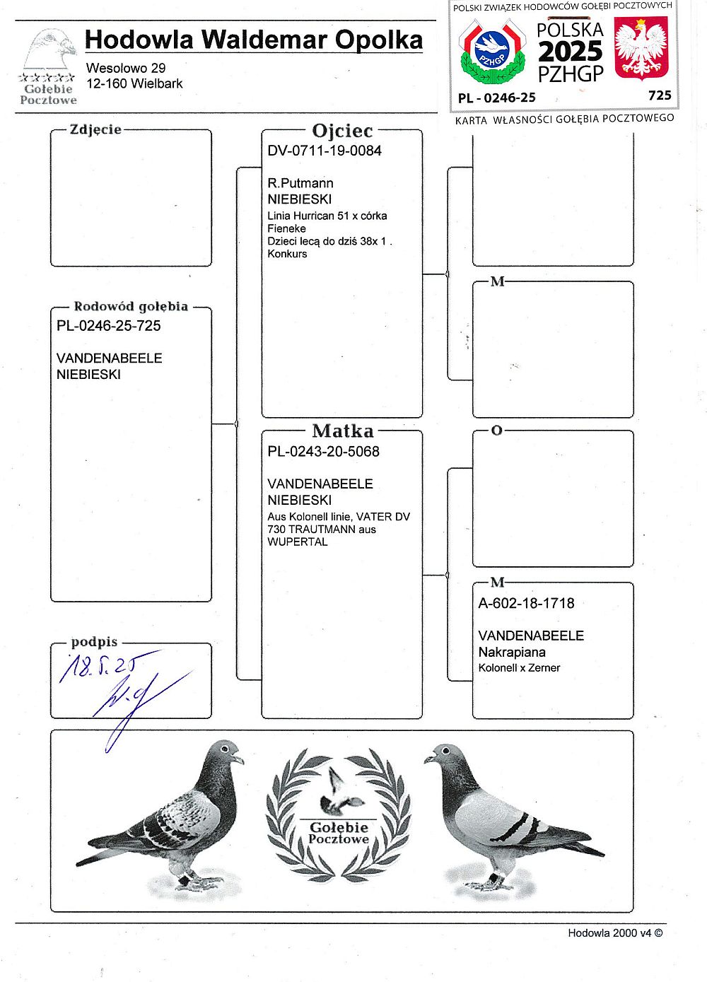 Waldemar Opolka, 16 miejsce w klasyfikacji AS, 1 z finału Gołąb uczestniczył w rywalizacji na WG Zatoka Puck 2025. Szczegóły pochodzenia w rodowodzie i załączonych materiałach. Wyniki lotowe w tabeli. Gołąb posiada tylko te materiały, które są widoczne na aukcji (karta własności, rodowód itp). Gołębie po zakończonej aukcji zostaną rozwiezione przez organizatora WG (koszt 150-200 zł w zależności od ilości gołębi i odległości), możliwy jest odbiór osobisty. Więcej informacji pod nr tel.: 503 164 320
