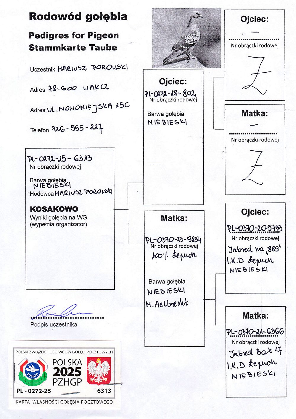 Mariusz Porowski, 468 miejsce w klasyfikacji AS, 170 z finału, 100 z ekstra finału Gołąb uczestniczył w rywalizacji na WG Zatoka Puck 2025. Szczegóły pochodzenia w rodowodzie i załączonych materiałach. Wyniki lotowe w tabeli. Gołąb posiada tylko te materiały, które są widoczne na aukcji (karta własności, rodowód itp). Gołębie po zakończonej aukcji zostaną rozwiezione przez organizatora WG (koszt 150-200 zł w zależności od ilości gołębi i odległości), możliwy jest odbiór osobisty. Więcej informacji pod nr tel.: 503 164 320