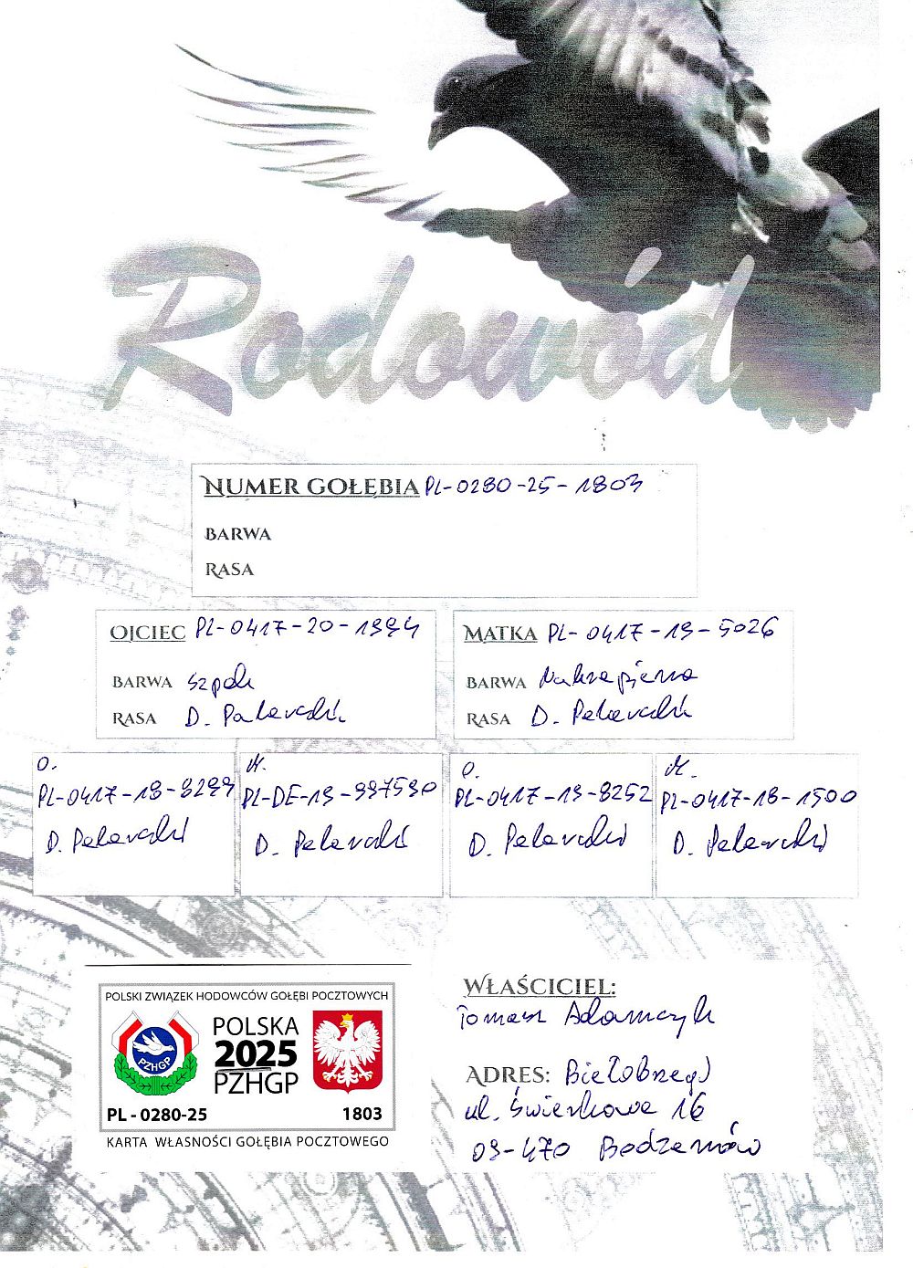Lot | Data | Dystans [km] | Ilość gołębi | Pozycja | Prędkość [m/min] |
