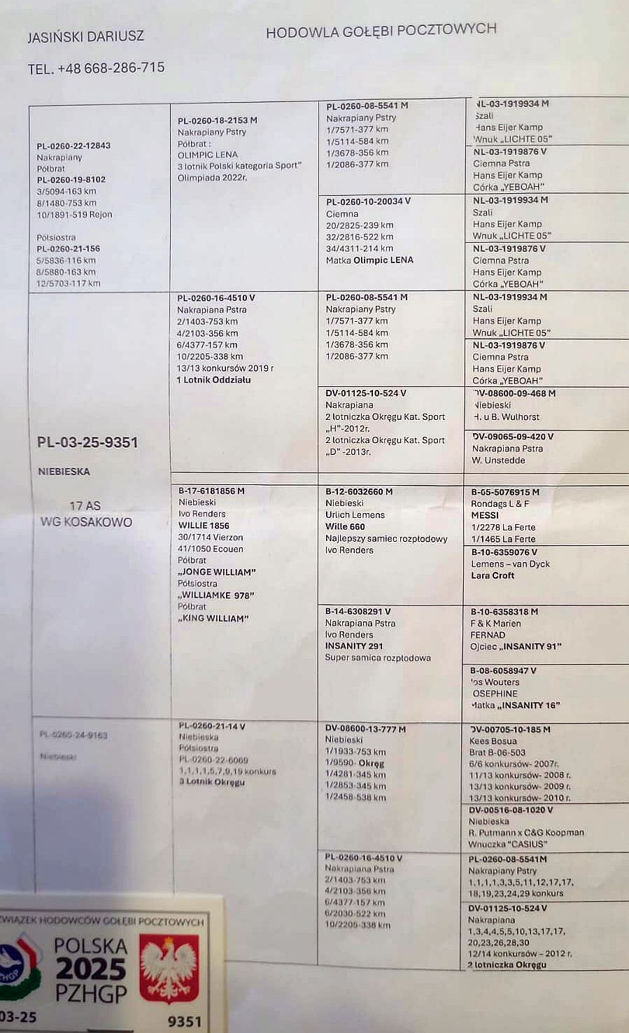 Darek 68, 17 miejsce w klasyfikacji AS, 102 z finału, 49 z ekstra finału Gołąb uczestniczył w rywalizacji na WG Zatoka Puck 2025. Szczegóły pochodzenia w rodowodzie i załączonych materiałach. Wyniki lotowe w tabeli. Gołąb posiada tylko te materiały, które są widoczne na aukcji (karta własności, rodowód itp). Gołębie po zakończonej aukcji zostaną rozwiezione przez organizatora WG (koszt 150-200 zł w zależności od ilości gołębi i odległości), możliwy jest odbiór osobisty. Więcej informacji pod nr tel.: 503 164 320