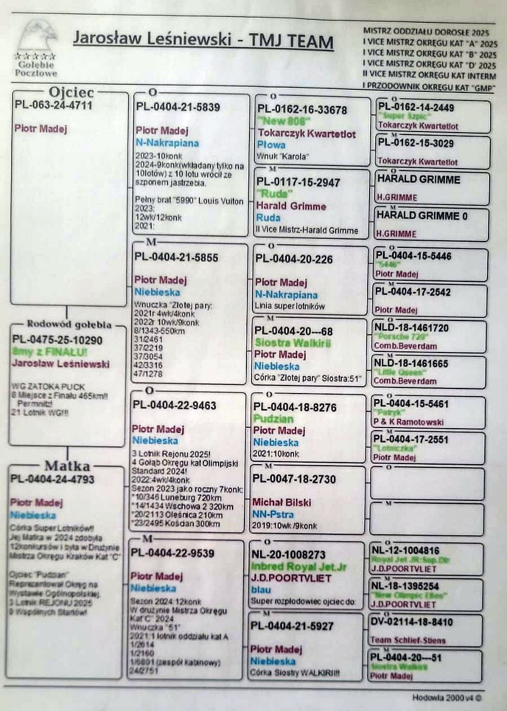 TMJ Team, 21 miejsce w klasyfikacji AS, 8 z finału Gołąb uczestniczył w rywalizacji na WG Zatoka Puck 2025. Szczegóły pochodzenia w rodowodzie i załączonych materiałach. Wyniki lotowe w tabeli. Gołąb posiada tylko te materiały, które są widoczne na aukcji (karta własności, rodowód itp). Gołębie po zakończonej aukcji zostaną rozwiezione przez organizatora WG (koszt 150-200 zł w zależności od ilości gołębi i odległości), możliwy jest odbiór osobisty. Więcej informacji pod nr tel.: 503 164 320