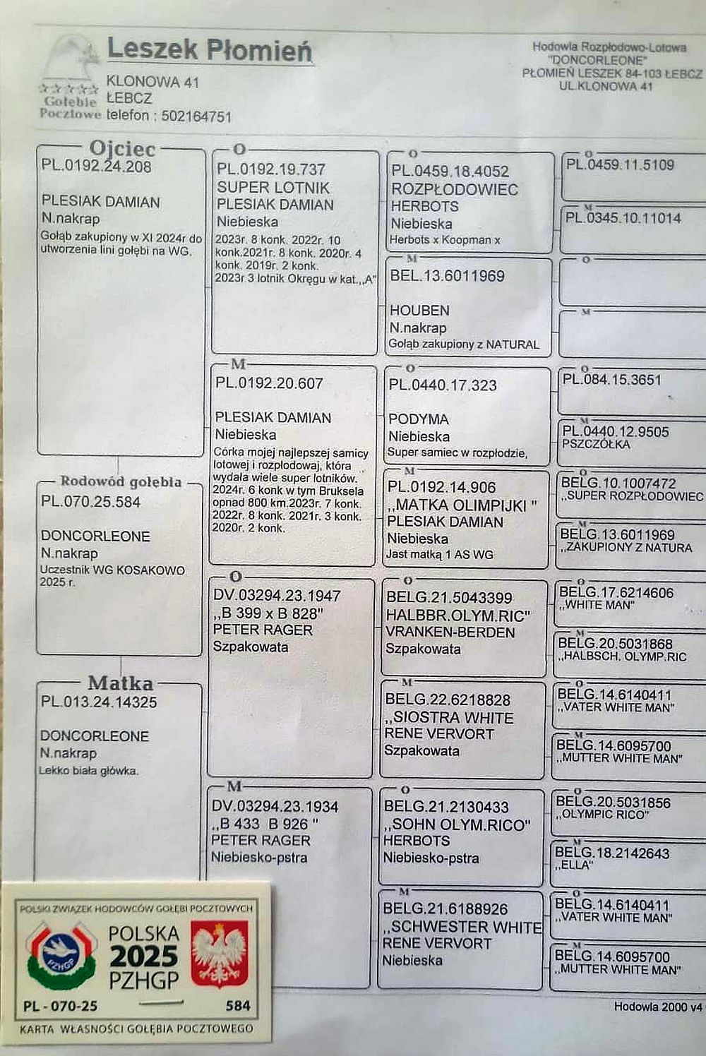 Don Corleone, 127 miejsce w klasyfikacji AS, 86 z finału, 36 z ekstra finału Gołąb uczestniczył w rywalizacji na WG Zatoka Puck 2025. Szczegóły pochodzenia w rodowodzie i załączonych materiałach. Wyniki lotowe w tabeli. Gołąb posiada tylko te materiały, które są widoczne na aukcji (karta własności, rodowód itp). Gołębie po zakończonej aukcji zostaną rozwiezione przez organizatora WG (koszt 150-200 zł w zależności od ilości gołębi i odległości), możliwy jest odbiór osobisty. Więcej informacji pod nr tel.: 503 164 320