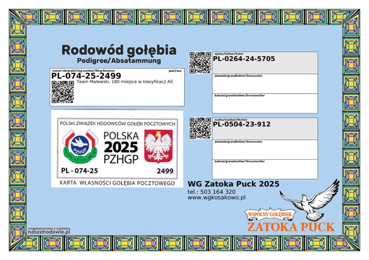 Team Malewski, 180 miejsce w klasyfikacji AS, 83 z finału, 60 z ekstra finału Gołąb uczestniczył w rywalizacji na WG Zatoka Puck 2025. Szczegóły pochodzenia w rodowodzie i załączonych materiałach. Wyniki lotowe w tabeli. Gołąb posiada tylko te materiały, które są widoczne na aukcji (karta własności, rodowód itp). Gołębie po zakończonej aukcji zostaną rozwiezione przez organizatora WG (koszt 150-200 zł w zależności od ilości gołębi i odległości), możliwy jest odbiór osobisty. Więcej informacji pod nr tel.: 503 164 320