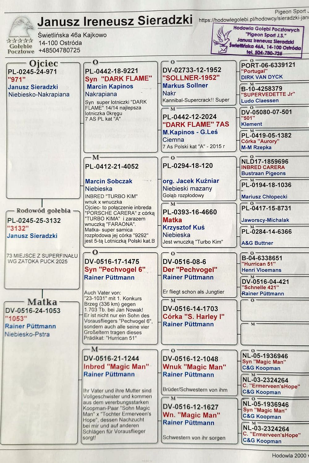 Sieradzki 2, 22 miejsce w klasyfikacji AS, 118 z finału, 73 z ekstra finału Gołąb uczestniczył w rywalizacji na WG Zatoka Puck 2025. Szczegóły pochodzenia w rodowodzie i załączonych materiałach. Wyniki lotowe w tabeli. Gołąb posiada tylko te materiały, które są widoczne na aukcji (karta własności, rodowód itp). Gołębie po zakończonej aukcji zostaną rozwiezione przez organizatora WG (koszt 150-200 zł w zależności od ilości gołębi i odległości), możliwy jest odbiór osobisty. Więcej informacji pod nr tel.: 503 164 320
