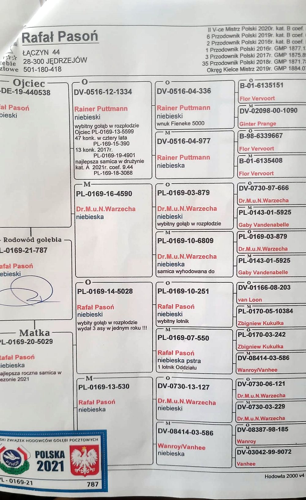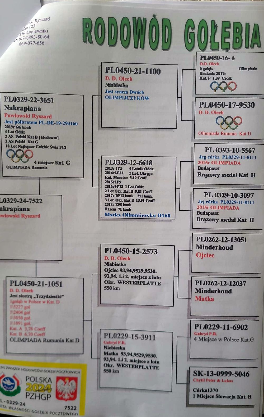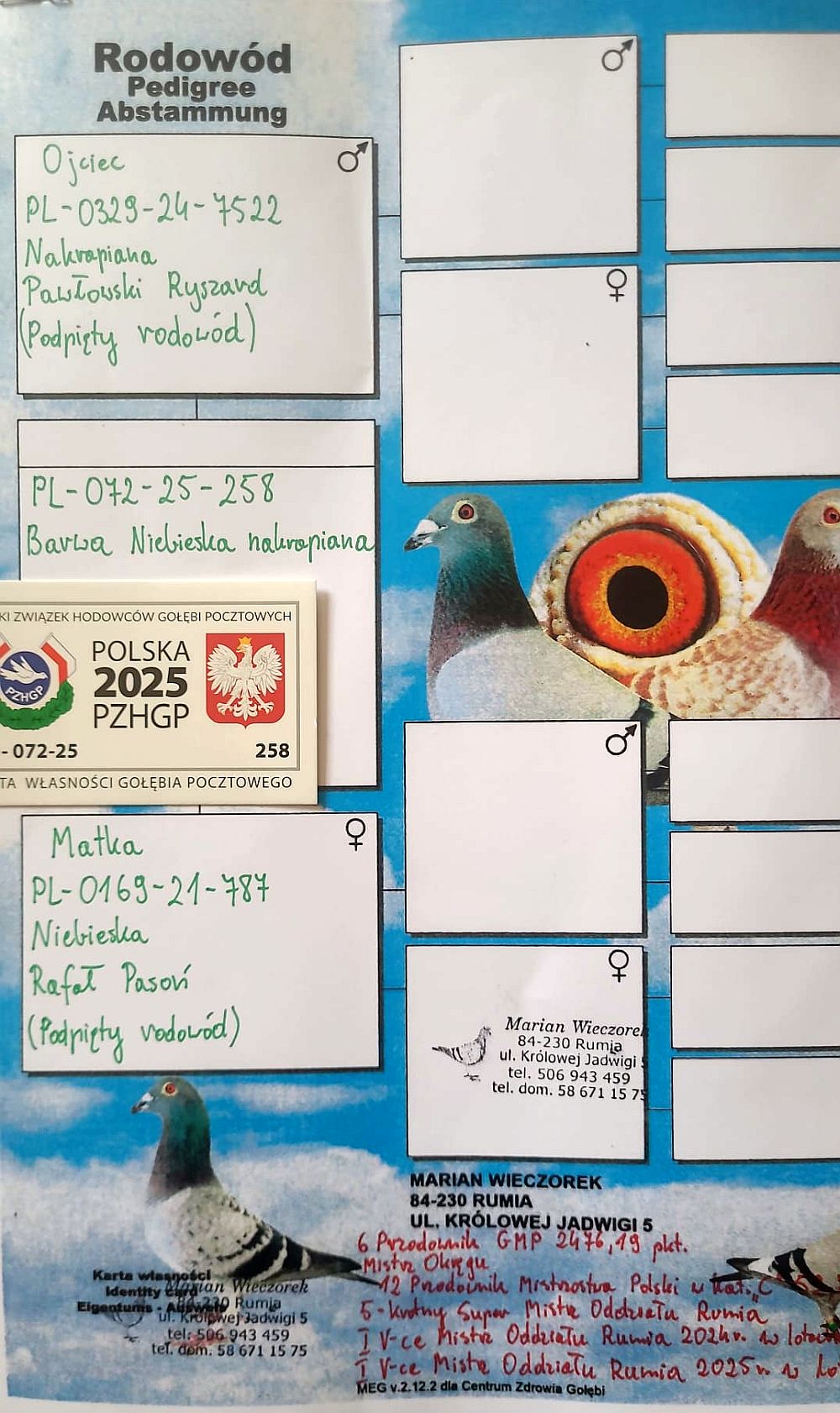 Wieczorek-Janca, 198 miejsce w klasyfikacji AS, 116 z finału, 35 z ekstra finału Gołąb uczestniczył w rywalizacji na WG Zatoka Puck 2025. Szczegóły pochodzenia w rodowodzie i załączonych materiałach. Wyniki lotowe w tabeli. Gołąb posiada tylko te materiały, które są widoczne na aukcji (karta własności, rodowód itp). Gołębie po zakończonej aukcji zostaną rozwiezione przez organizatora WG (koszt 150-200 zł w zależności od ilości gołębi i odległości), możliwy jest odbiór osobisty. Więcej informacji pod nr tel.: 503 164 320