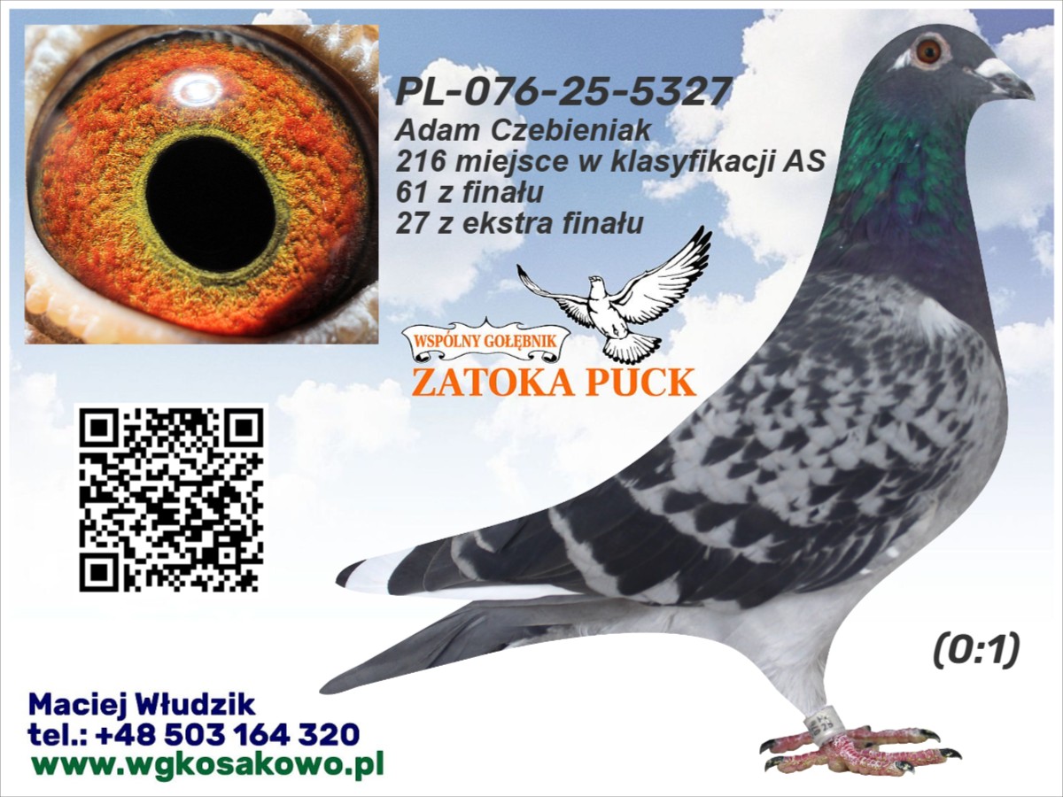 Adam Czebieniak, 216 miejsce w klasyfikacji AS, 61 z finału, 27 z ekstra finału Gołąb uczestniczył w rywalizacji na WG Zatoka Puck 2025. Szczegóły pochodzenia w rodowodzie i załączonych materiałach. Wyniki lotowe w tabeli. Gołąb posiada tylko te materiały, które są widoczne na aukcji (karta własności, rodowód itp). Gołębie po zakończonej aukcji zostaną rozwiezione przez organizatora WG (koszt 150-200 zł w zależności od ilości gołębi i odległości), możliwy jest odbiór osobisty. Więcej informacji pod nr tel.: 503 164 320