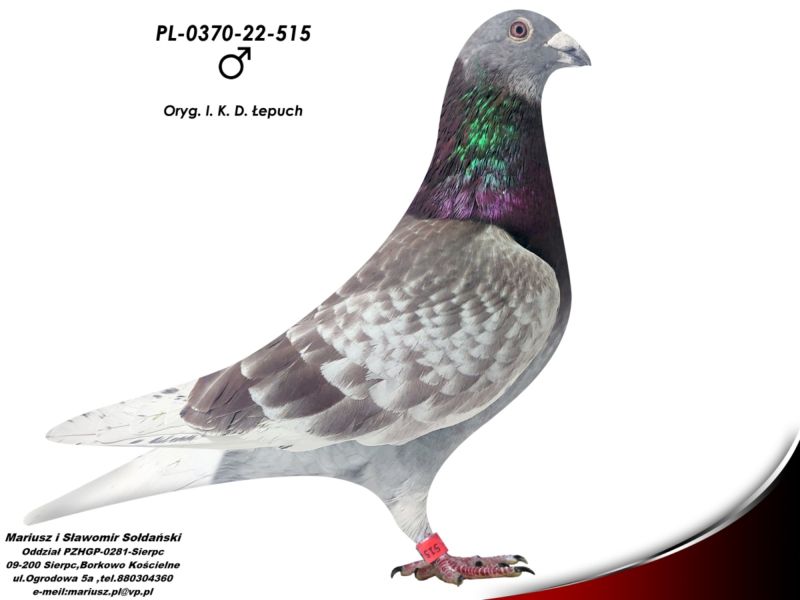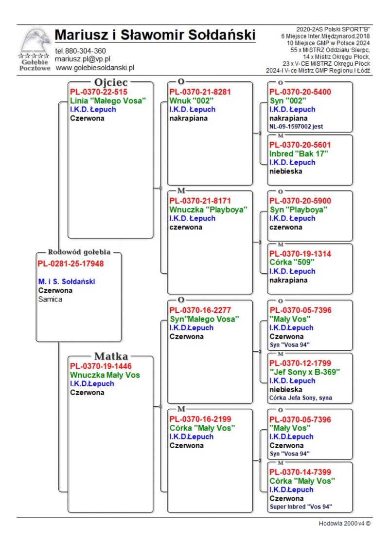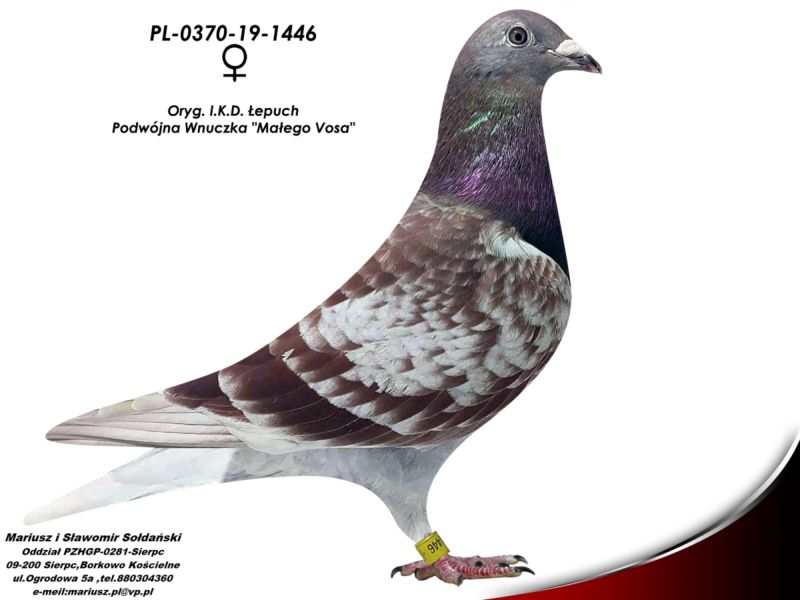 Oryginalna samica z hodowli M. i S. Sołdańscy super Linia "Vos 94" I.K.D. Łepuch . Więcej informacji o gołębiu pod nr tel. i poniższych materiałach. Nasze wyniki w Mistrzostwie Polski 2018: 6 Miejsce w Intermistrzostwie Międzynarodowym - coeff. 151,73; 23 Miejsce GMP - 1874,73; 29 Miejsce Kat.B - coeff. 86,45. 1 Miejsce Gołąb Średni dystans-Konkurs Redakcji "Hodowca", 1 Miejsce Kat."B"-Konkurs Redakcji "Dobry Lot", 3 Miejsce Kat."D"-Konkurs Redakcji "Dobry Lot", 2 Miejsce "Mistrzostwo Asów Allround"-Konkurs Redakcji "Dobry Lot", 1 Miejsce Kat."B"-Konkurs Redakcji "Poradnik Hodowcy". 2019-Oddział Sierpc: Typowane Mistrz, Open I-vce Mistrz, Open 50 II-V-ce Mistrz, 1 i 3 Lotnik Roczny, Kat. A II V-ce Mistrz, Kat. B II V-ce Mistrz, Kat. D II V-ce Mistrz, Kat. GMP I v-Ce Mistrz, Kat. Inter. I V-ce Mistrz, Super. I V-ce Mistrz. Okręg Płock: II V-ce Mistrz Supermistrzostwo, I V-ce Mistrz GMP, II Lotnik. kat. B. 10 Gołębi w Reprezentacji Okręgu na Wystawę Ogółnopolską 2020. 2 AS POLSKI SPORT „B”-14,62 coef. 2020-Oddział Sierpc: Typowane Mistrz, Open I-vce Mistrz, Open 50 I-V-ce Mistrz, 1 Lotniczka Roczna, Kat. C Mistrz, Kat. M II V-ce Mistrz, Kat. D II V-ce Mistrz, Kat. GMP Mistrz, Kat. Inter. II V-ce Mistrz, Mistrz. Okręg Płock: Kat. GMP Mistrz , Kat.Roczne Mistrz, Kat. C-I Vce Mistrz , Kat. M - I Vce Mistrz Mistrz.Regionu I Łódż- V-ce Mistrz „Roczne” 2021- Supermistrz Oddziału Sierpc Mistrz Okręgu Płock Kat." Maraton" Supermistrz Okręgu Płock,2022 6 gołębi w reprezentacji Okręgu Płock na Wystawę Ogólnopolską.2022- II Supermistrz Oddziału Sierpc, 8 x V-ce Mistrz Oddziału. 1 AS WG Kaszuby 2022, 2 drużyna WG Kosakowo 2022, 4 AS WG Kosakowo. 6 AS WG Roztocze 2022. 6 gołębi w reprezentacji Okręgu Płock na Wystawę Ogólnopolską 2023. 2022-1 Samica w Polsce PL-0281-17-3077 w Kat. "Supermaraton"- Konkurs Redakcji"Hodowca". 2024 - 10 Miejsce w Polsce w kat. GMP 1 Miejsce Finał Wg Zatoka Puck 3 i 6 As Zatoka Puck